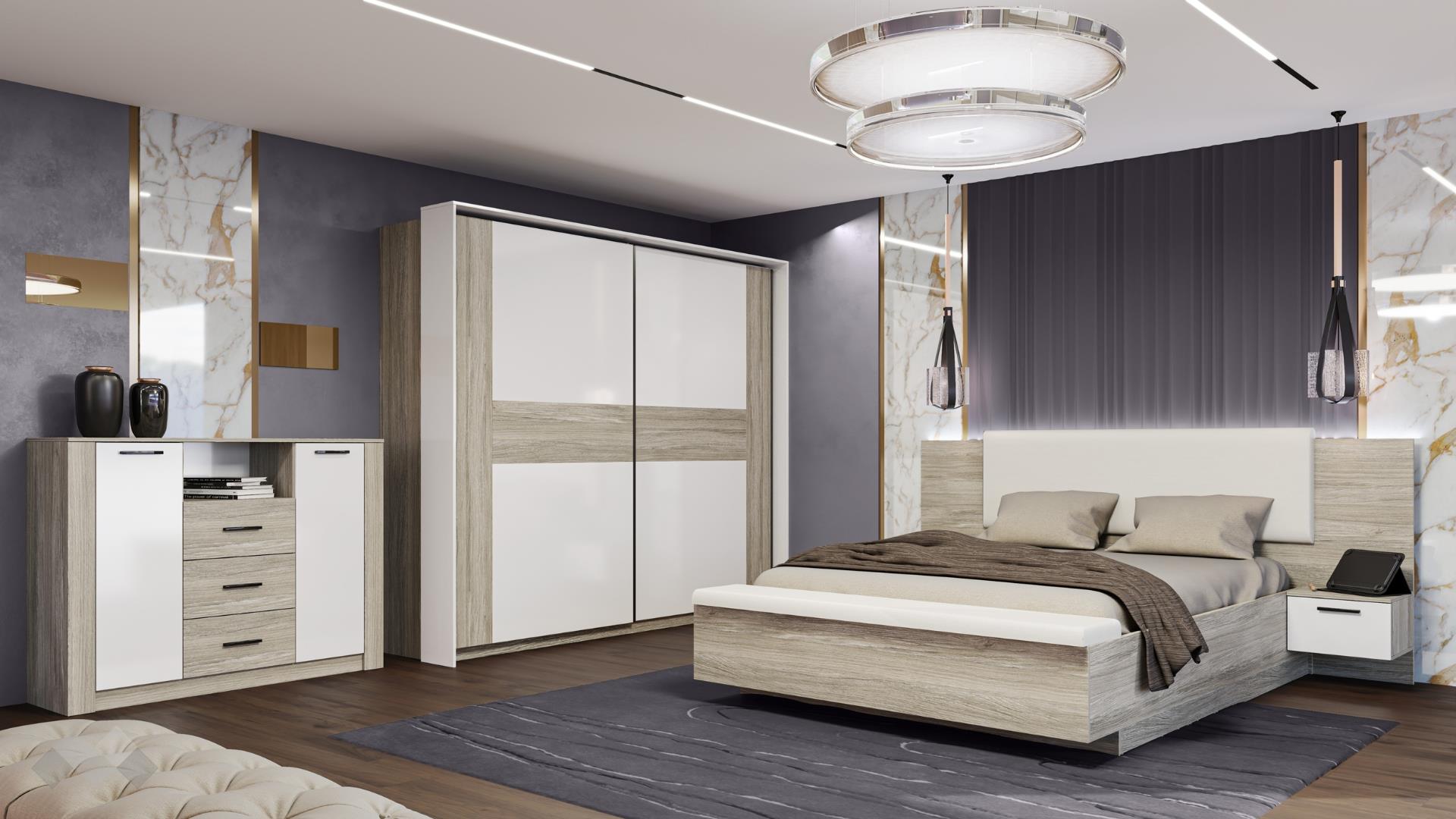 ⭐ Предимства: ✓ издръжлива конструкция от 18 мм ПДЧ ✓ спалня с тапицирана табла за матрак 160/200 ✓ гардероб с плъзгащи врати ✓ скрин с три чекмеджета и две врати ✓ две нощни шкафчета ✓ изискан и стилен дизайн