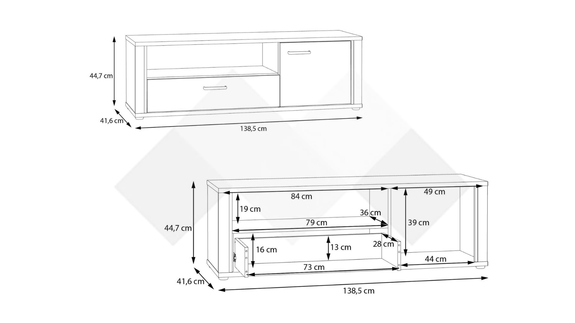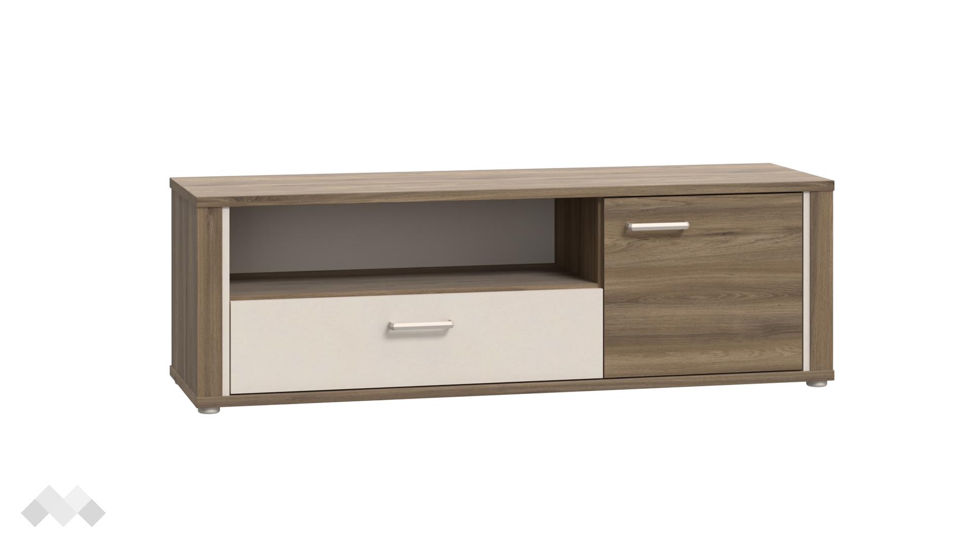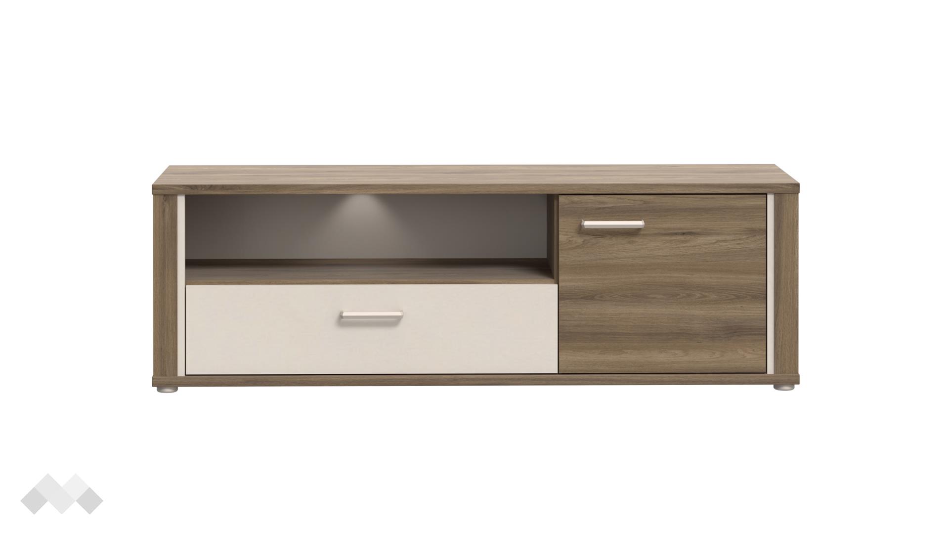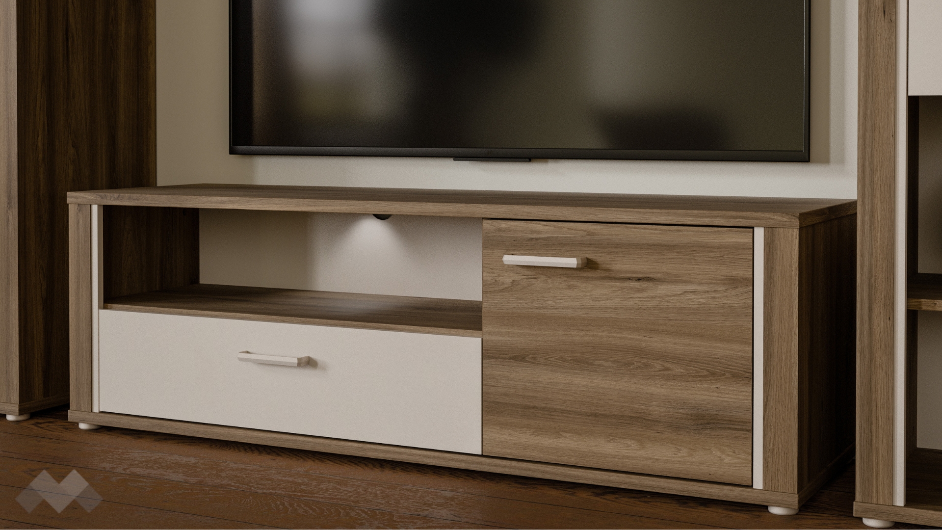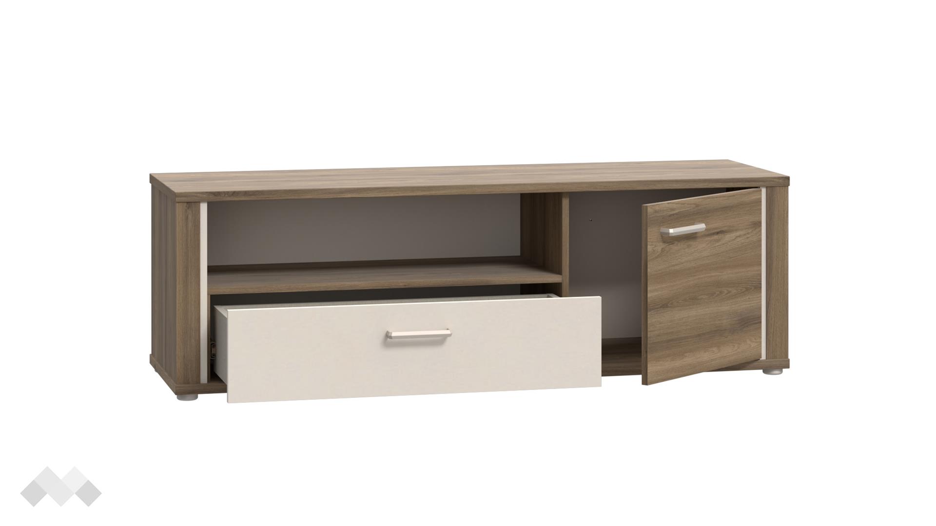 Шкафът разполага с едно чекмедже, което е подходящо за съхранение на лични вещи, докато шкафът с вратичка осигурява безопасно място за по-големи устройства, като DVD плейъри или игрални конзоли. Отвореният шкаф е чудесен за показване на декоративни предмети или книги, придавайки индивидуалност на интериора.