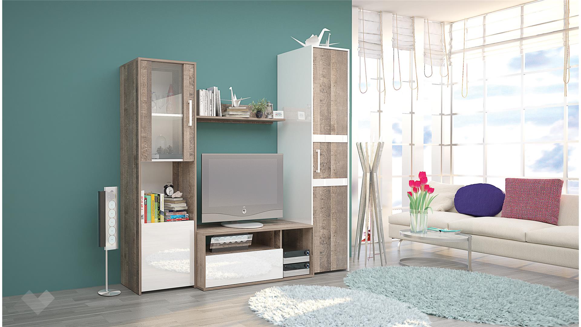 Основата на секцията представлява ТВ шкаф с две отворени ниши и шкаф с падаща врата, където ще откриеш достатъчно място за декодери, конзоли и друга съпътстваща техника. Високият шкаф се състои от отворена ниша и два затворени шкафа с по един рафт. Единият затворен шкаф е с остъклена врата, за да може да го ползваш като витрина. Зад вратите на еднокрилния гардероб ще видиш три рафта, готови да поберат всички вещи, които искаш да останат скрити. Към секцията сме добавили и практична етажерка, подходяща за подреждане на книги, скъпи спомени като фотографии или сувенири, а можеш и да аранжираш със стилни декорации и украси – изборът е твой!