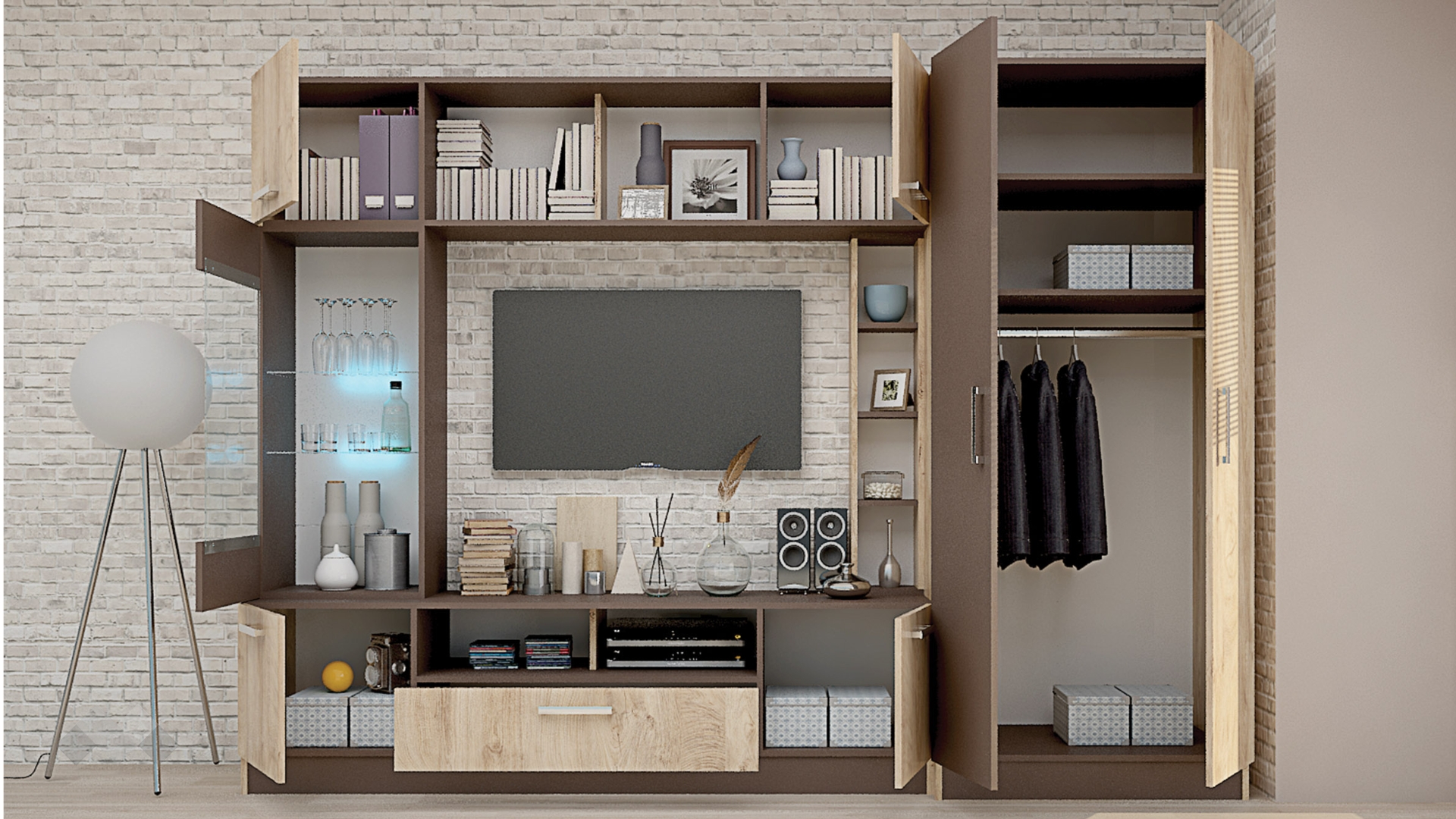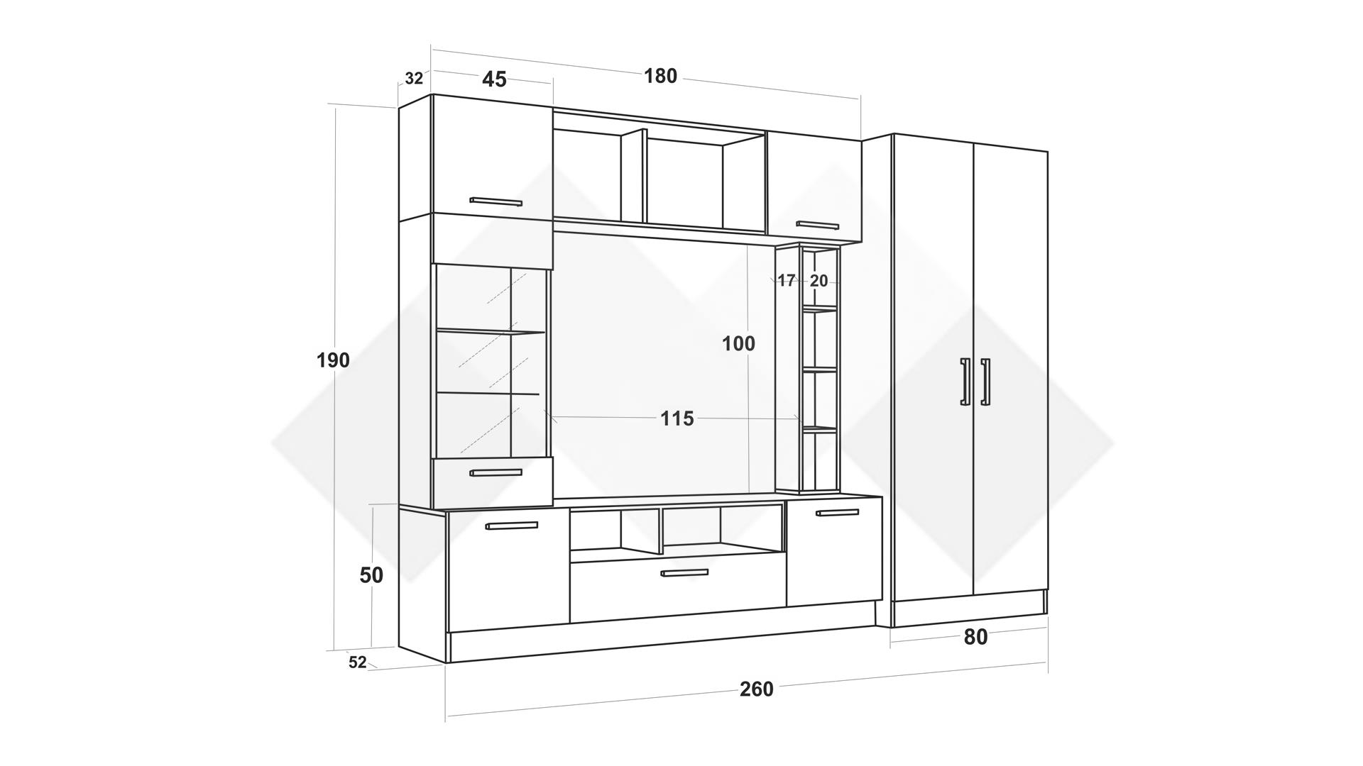 ТВ шкафът се състои от два шкафа с вратички, две отворени ниши и голямо чекмедже. Там ще откриеш достатъчно място за цялата си съпътстваща техника като ТВ приемници, DVD плейъри или други. Витринният шкаф е с два остъклени рафта, подходящи за красивите ти сервизи или любимите сувенири, които ще засияят благодарение на дискретното LED осветление, а това няма как да убегне от погледите на гостите ти. Над ТВ шкафа разполагаш с етажерка, на която можеш да подредиш стилни декорации, скъпи фотографии или други неща, които искаш да бъдат видими за твоите гости. В горната част на секцията са позиционирани два отворени шкафа за любимите ти книги и сувенири, както и два затворени шкафа за вещите, които искаш да останат скрити от погледите. Зад вратите на двукрилния гардероб се крият лост за закачалки и два рафта, където можеш да организираш дрехите, за които все не ти достига място в гардероба в спалнята.