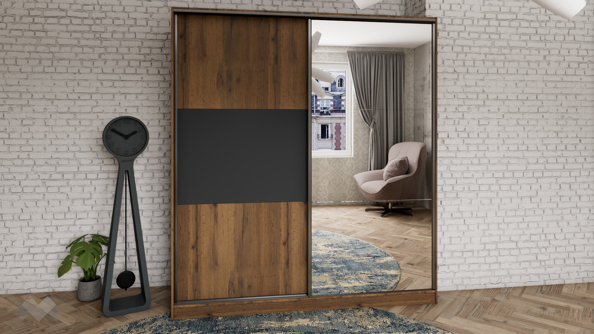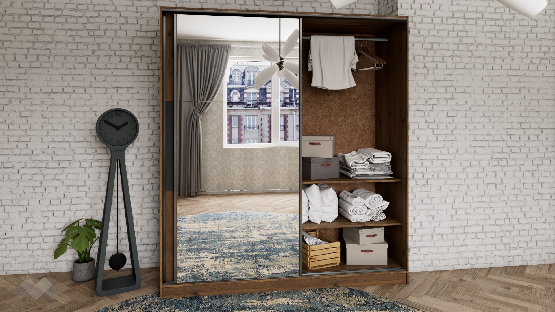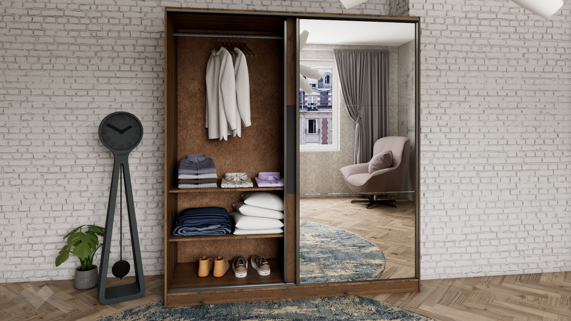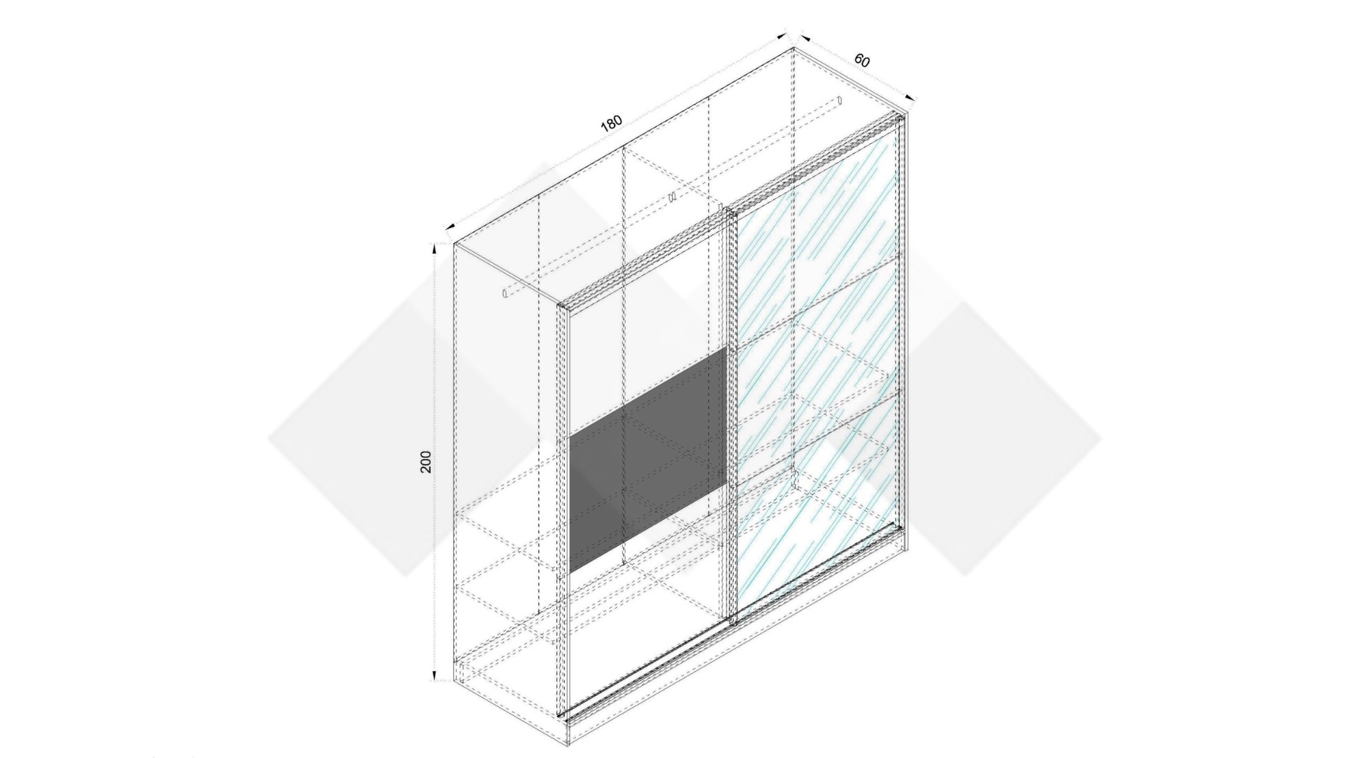 Гардероб Димана е с плъзгащи врати, практично разпределен и изцяло отговарящ на съвременните стандарти за съхранение на дрехи. Той разполага с четири широки рафта и два лоста за закачалки. Ще ти допадне и огледалото, разположено на вратата – благодарение на него стаята ще бъде по-осветена и ще изглежда визуално по-голяма. Плъзгащите врати правят гардероба подходящ дори за най-малките спални, тъй като за отварянето им не се нуждаеш от допълнително пространство. В същото време, дълбочината на гардероба позволява да съхраняваш вътре и по-обемни вещи.