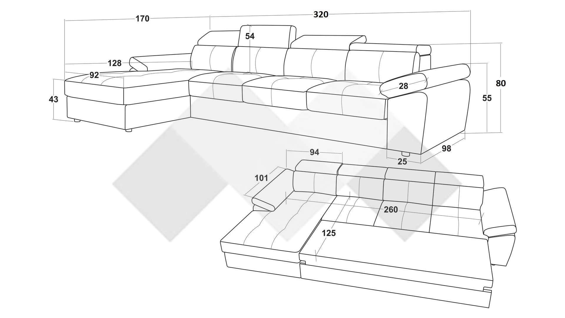 Моделът разполага с функция сън с площ 260 см дължина и 125 см ширина, която се активира чрез издърпващ механизъм – практично и лесно решение за настаняване на гости или ежедневна употреба. Под лежанката е разположена ракла за съхранение, осигуряваща допълнително пространство за завивки, възглавници или други вещи.