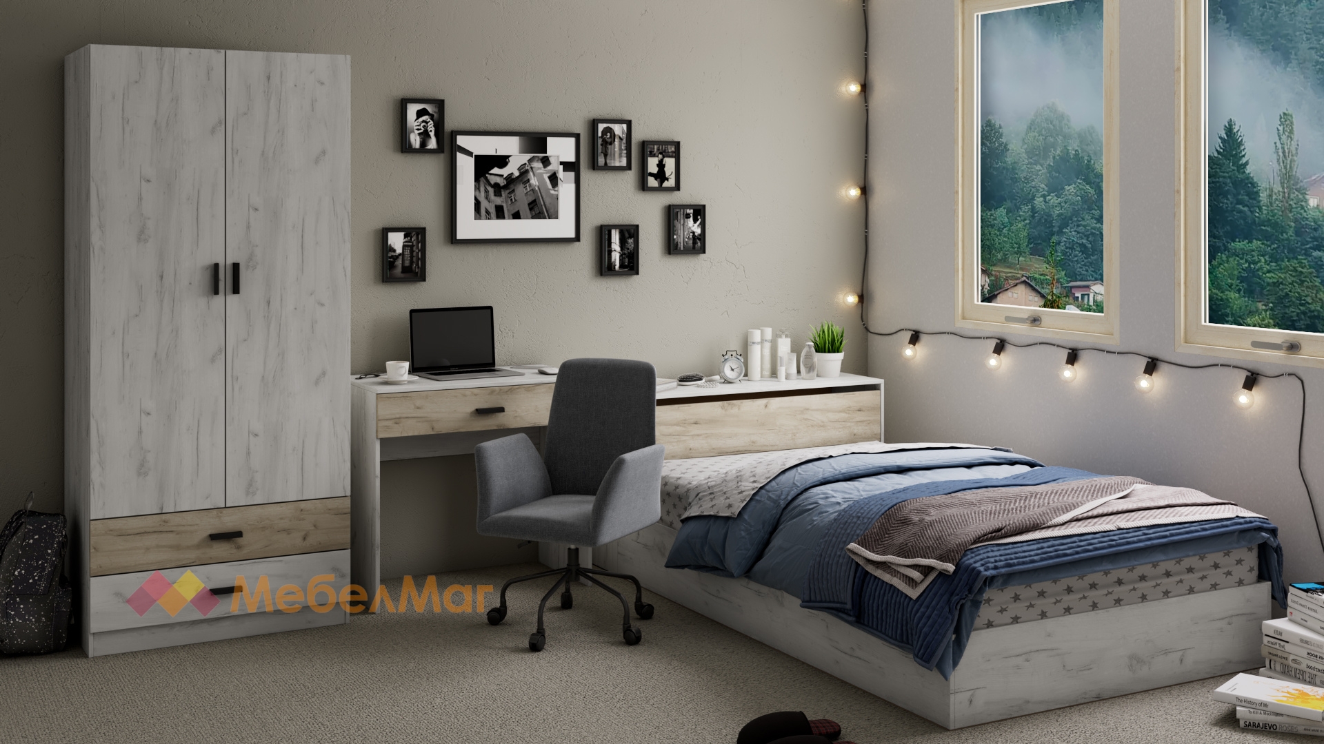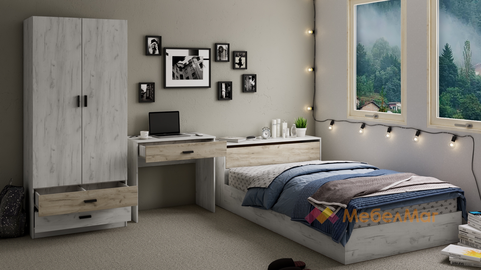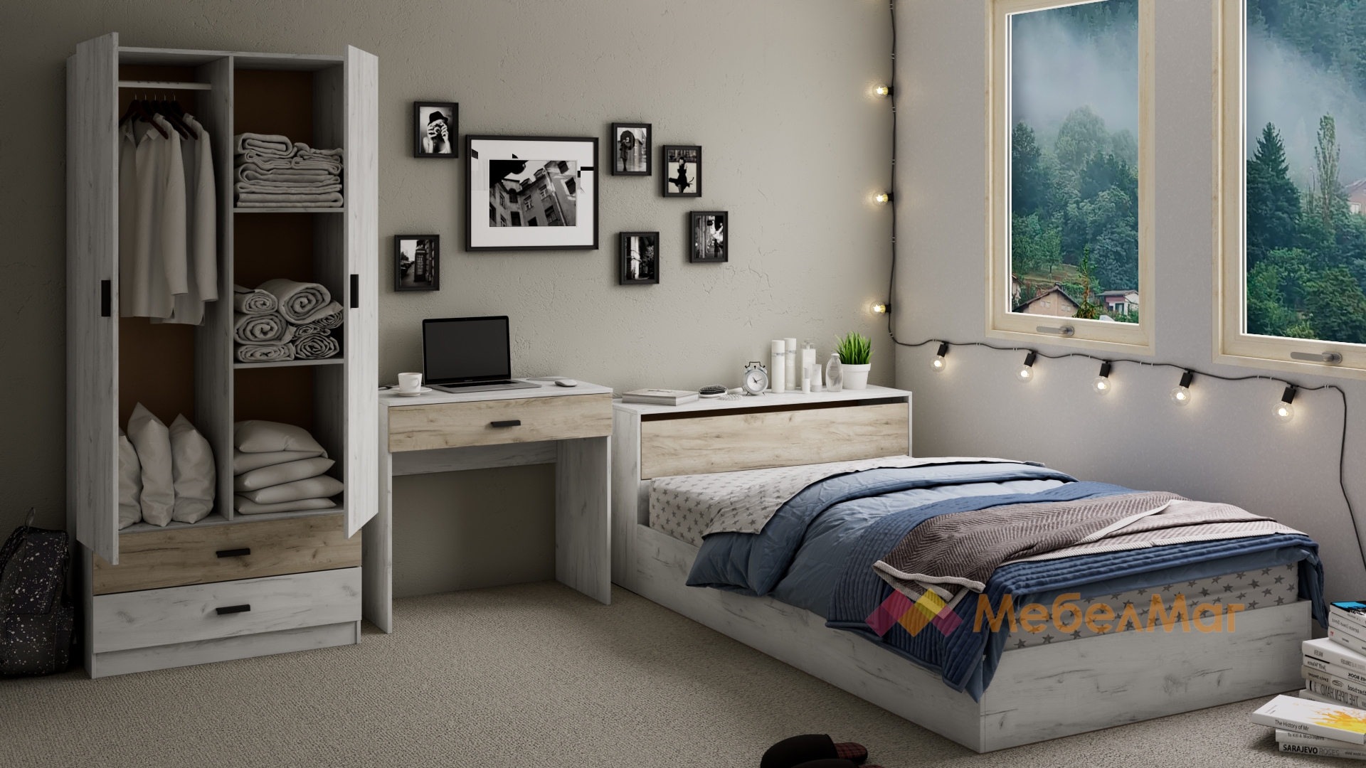 Комплектът разполага и с двукрилен гардероб. Той е практично разпределен, изцяло отговарящ на съвременните стандарти за съхранение на дрехи. Щом отвориш вратите, ще видиш два рафта за всички дрехи, които съхраняваш сгънати, както и лост за закачалки, подходящ за елегантното облекло, което се мачка лесно. Благодарение на двете чекмеджета разполагаш с достатъчно място за организация на аксесоари, чорапи, бельо или дребни ел. уреди.