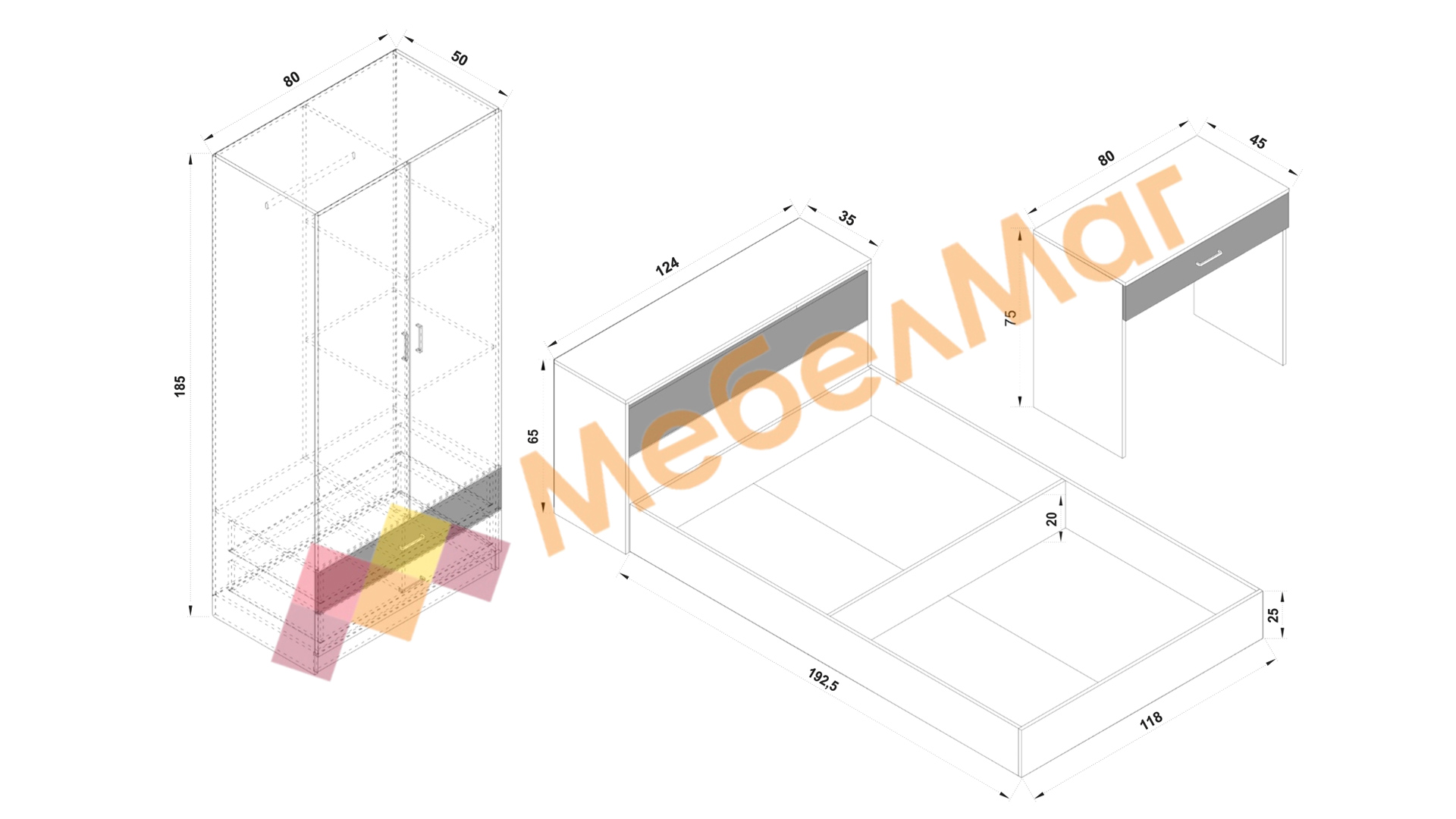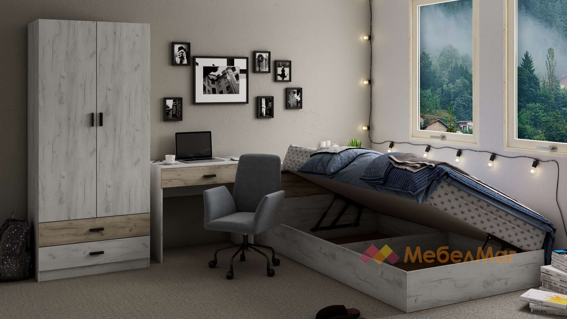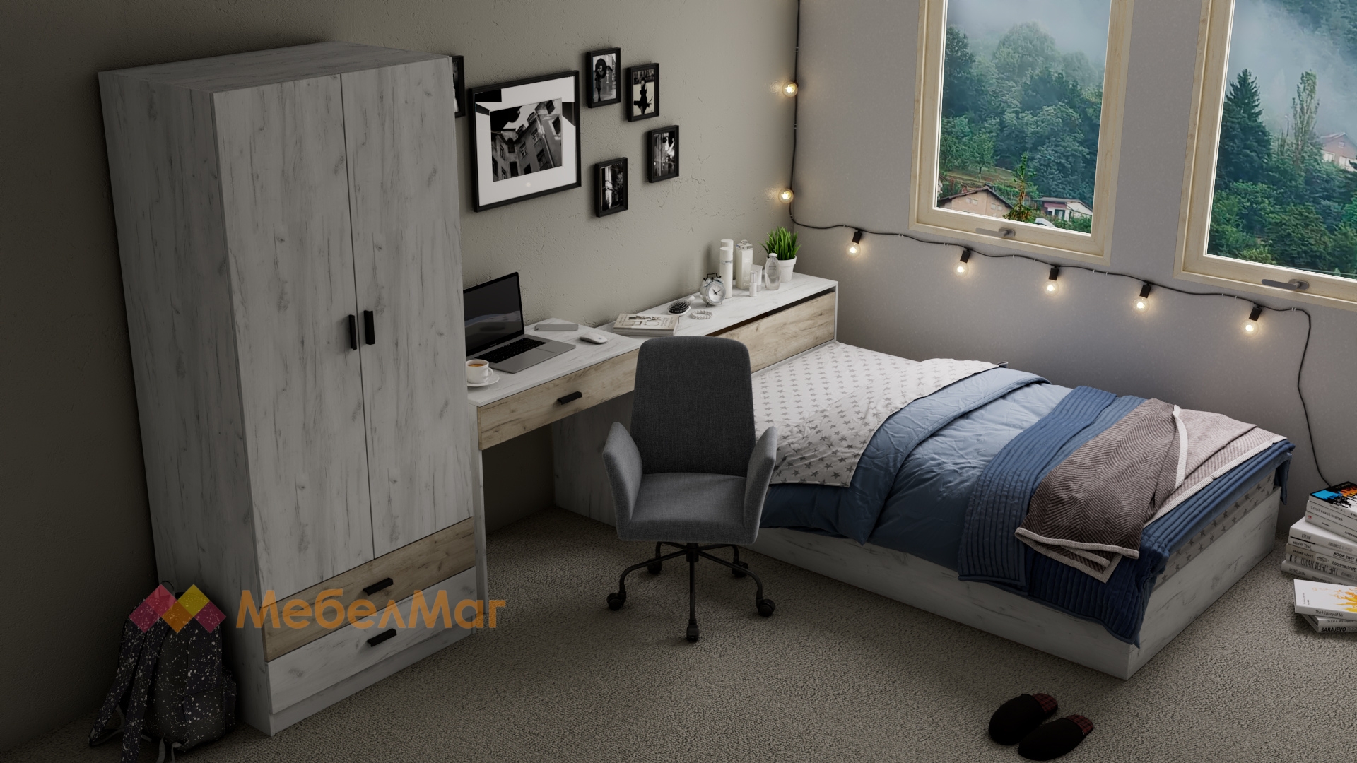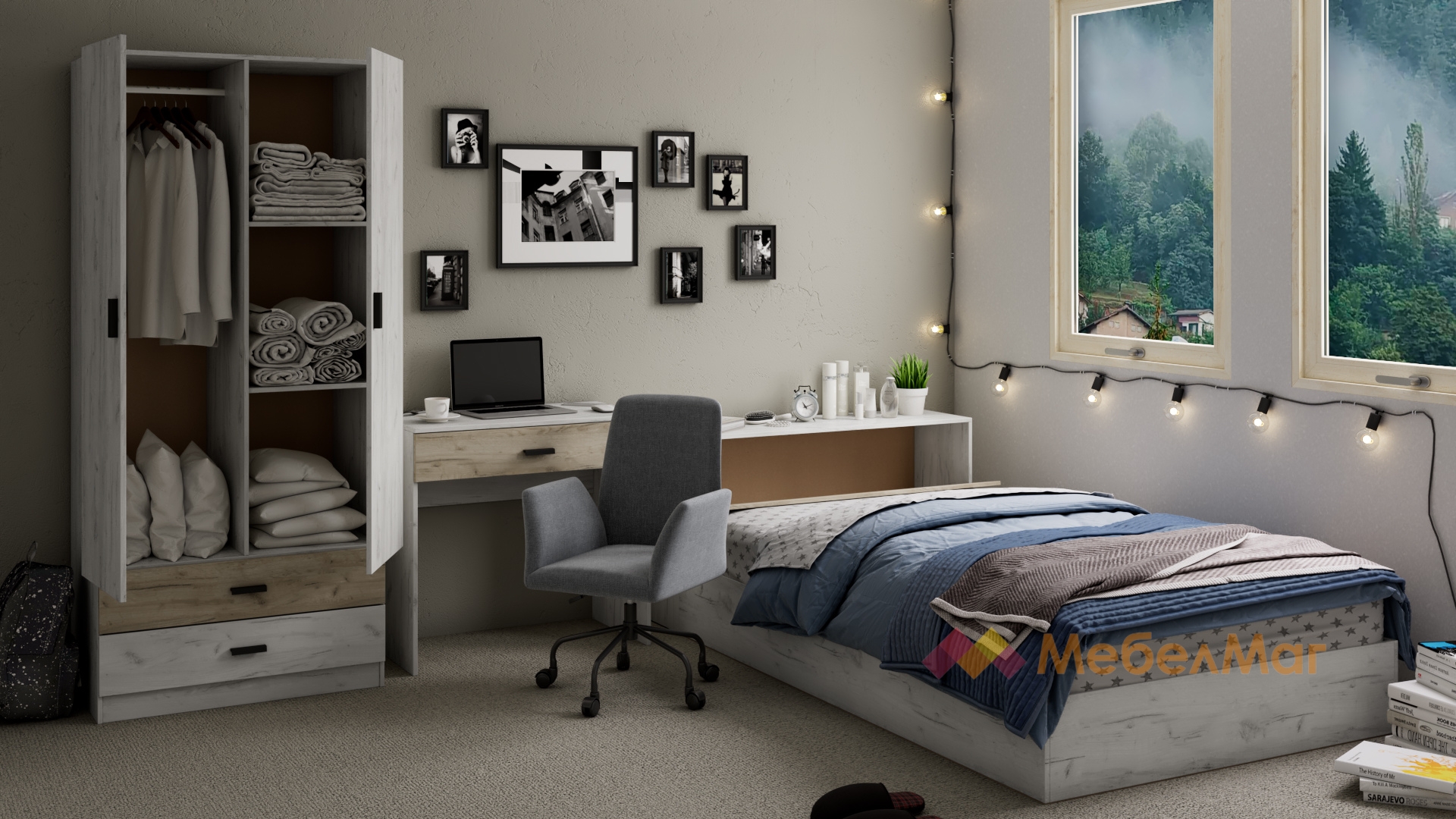Комплектът разполага и с двукрилен гардероб. Той е практично разпределен, изцяло отговарящ на съвременните стандарти за съхранение на дрехи. Щом отвориш вратите, ще видиш два рафта за всички дрехи, които съхраняваш сгънати, както и лост за закачалки, подходящ за елегантното облекло, което се мачка лесно. Благодарение на двете чекмеджета разполагаш с достатъчно място за организация на аксесоари, чорапи, бельо или дребни ел. уреди.