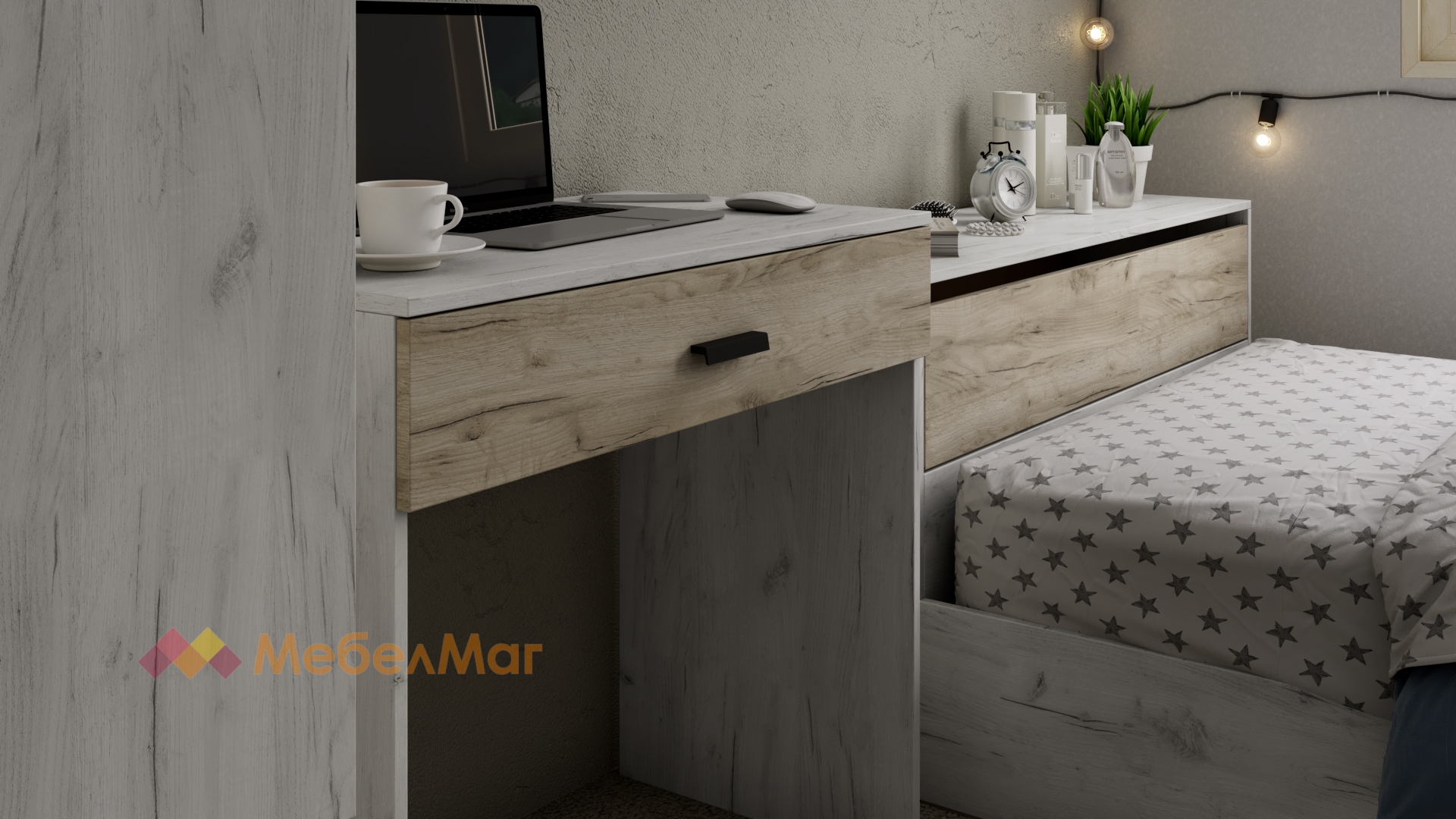 Бюрото е със семпъл дизайн и изчистени форми. Плотът е достатъчно широк, за да можеш да поставиш лаптоп или настолен компютър, но и в същото време ще остане място за работа с документи и книжа. Под плота ще видиш просторно чекмедже, готово да побере всички работни материали и вещи, които са ти необходими в ежедневието.