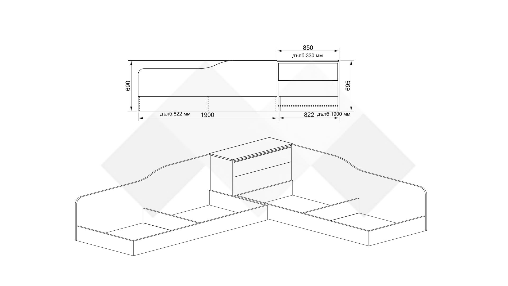 Корпусът на леглата е изпълнен от 16мм ЛПДЧ с меламиново покритие, устойчиво на надраскване и износване, благодарение на което мебелите ще запазят задълго безупречния си вид, а почистването им е лесно и бързо.
