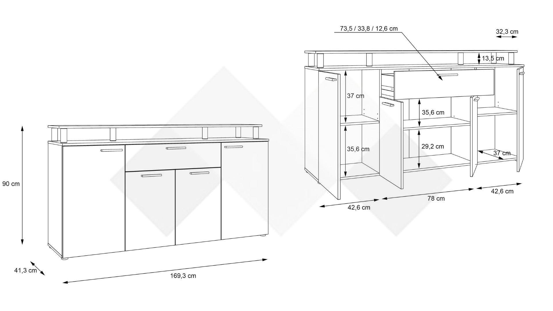 Д: 169,3 см Ш: 41,3 см В: 90 см
