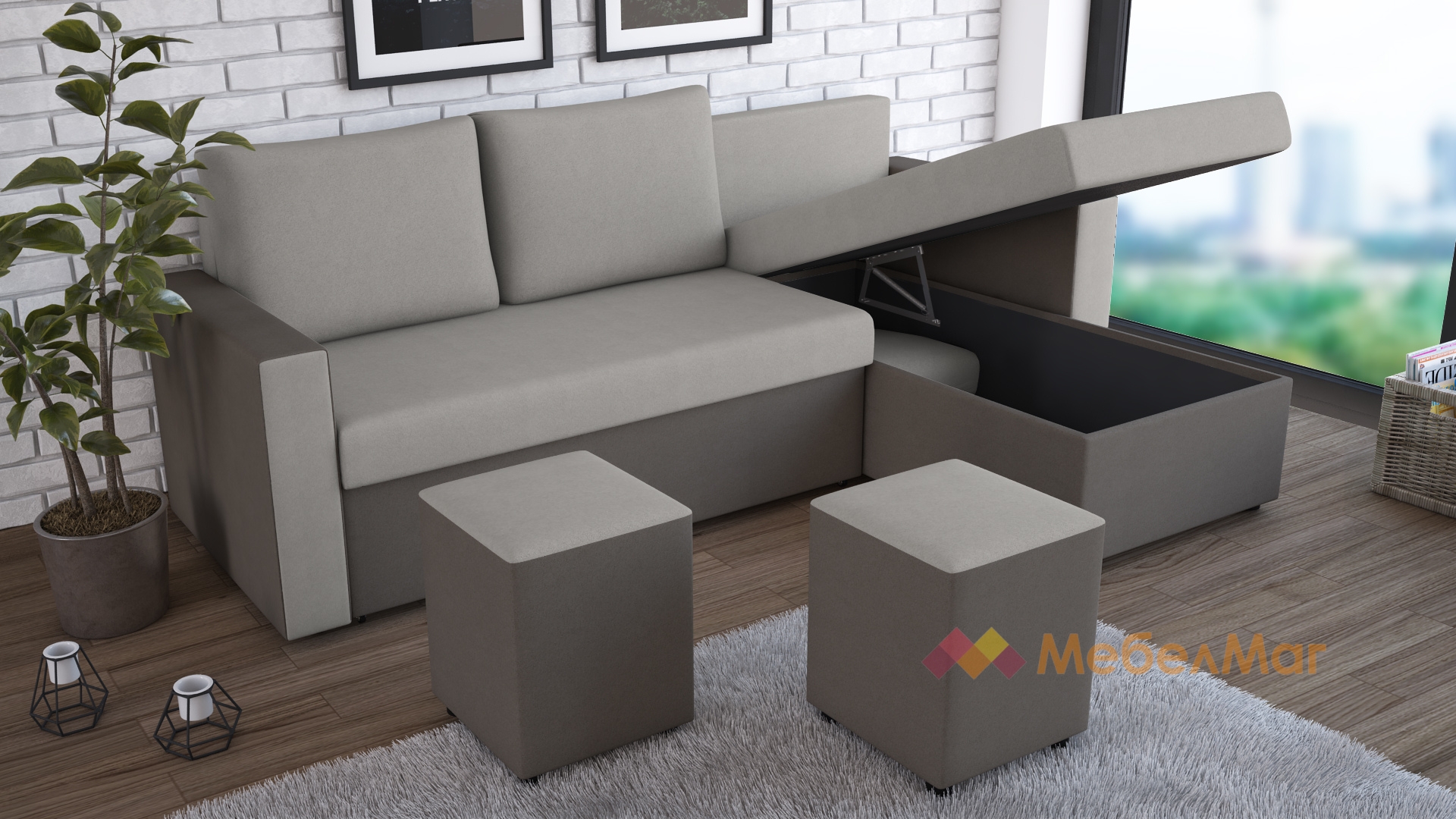 Дивана е много удобен и размерите му са много компактни. Има място за съхранение на багаж, а табуретките към него са много симпатични и практични при гости.