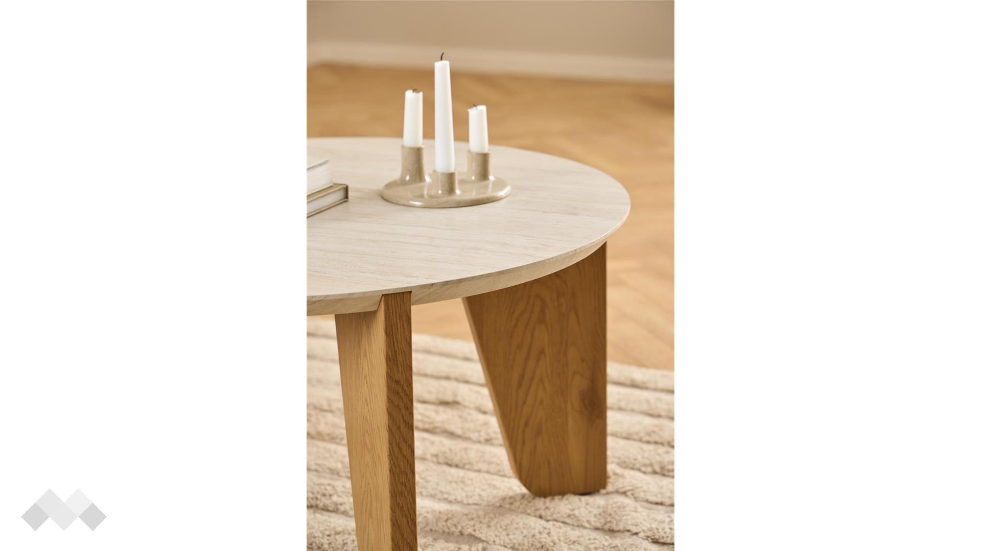 Холна маса Докланд е съвършено съчетание на минимализъм и съвременен дизайн. Със своята кръгла форма и гладките ръбове, тя придава усещане за мекота и елегантност в интериора. Плотът от МДФ осигурява здравина и издръжливост, като същевременно запазва модерния си и изчистен вид.