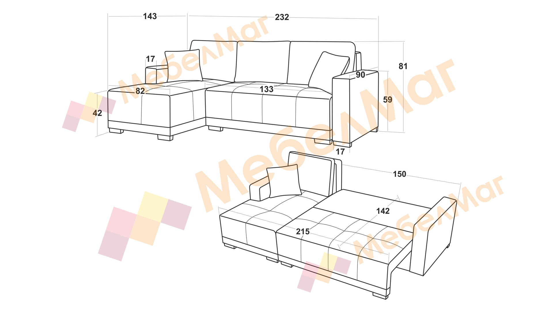 Ъглов диван Дъглас за миг се превръща в широко легло, благодарение на изтеглящия се механизъм за сън с падащ гръб, гарантиращ комфортна почивка на цялата спална площ с размери 142/215 см. Под седалката се крие ракла, където да съхраняваш завивки, възглавници и други вещи.
