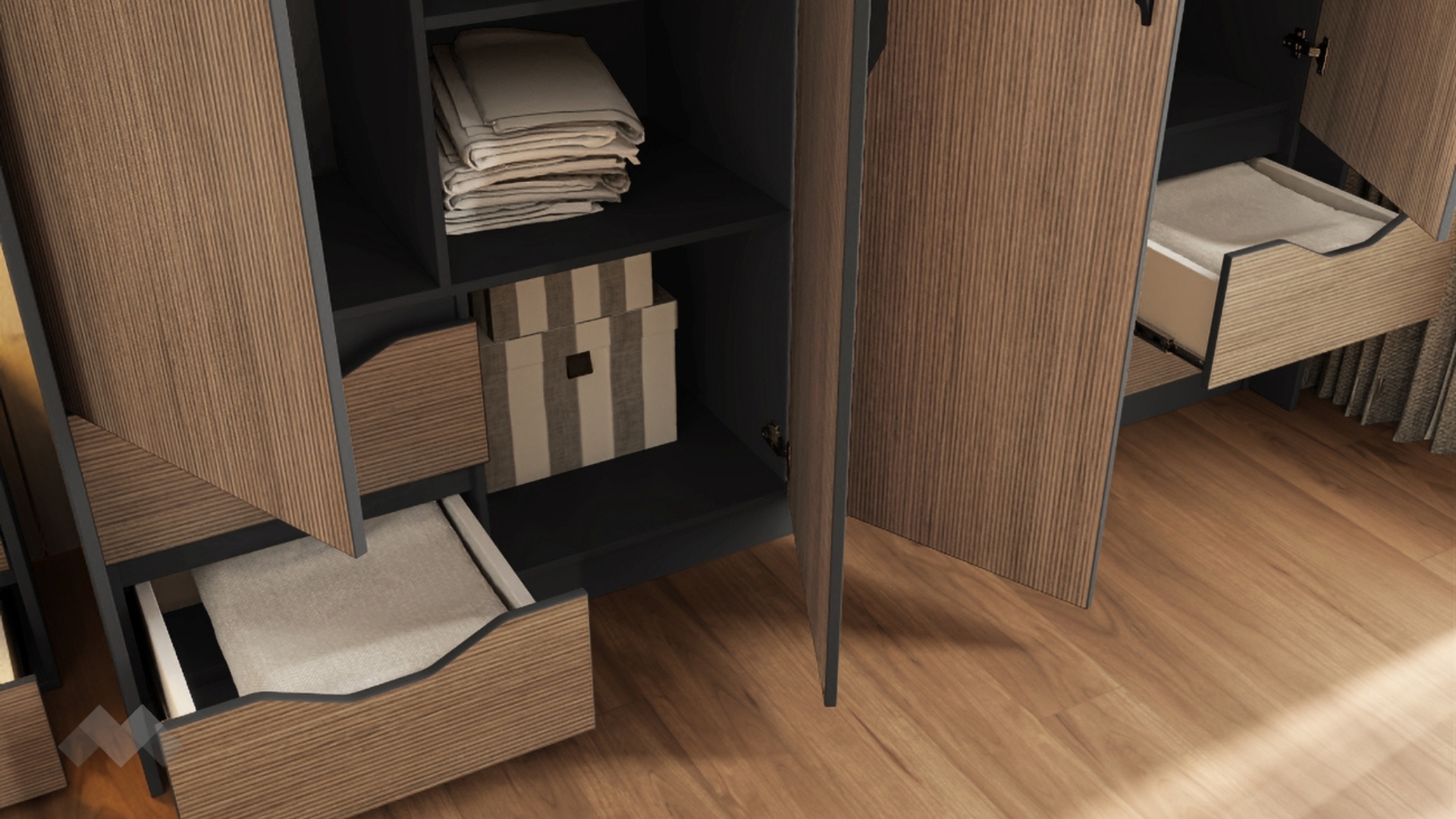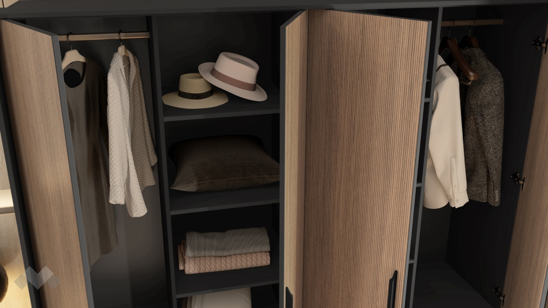 Четирикрилният гардероб ти дава свободата да подредиш дрехите и аксесоарите си така, както обичаш. С помощта на рафтовете и двата лоста за закачалки всяка дреха ще си има своето място. Гардеробът разполага и с четири чекмеджета, в които лесно да организираш бельо или други аксесоари.