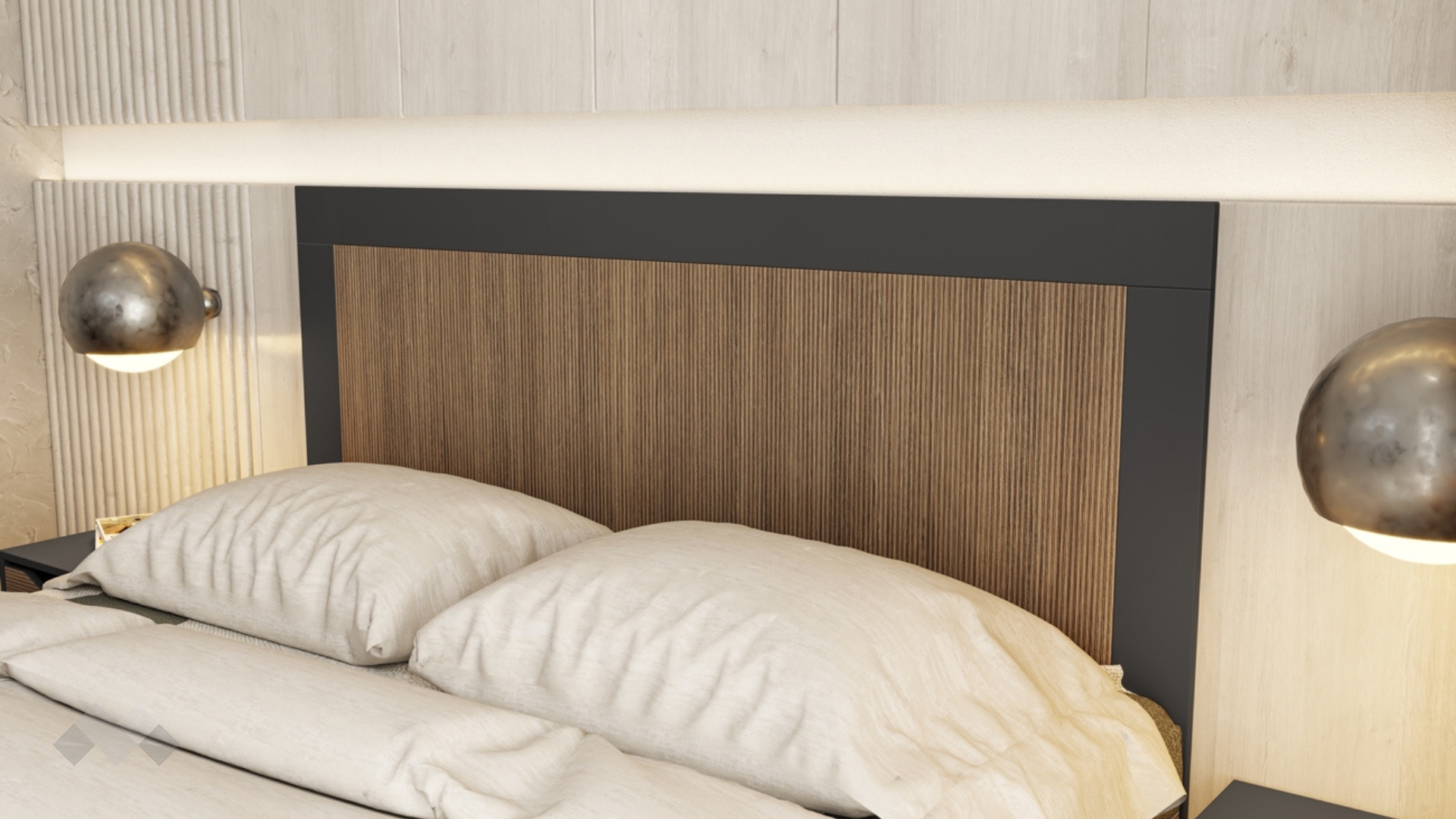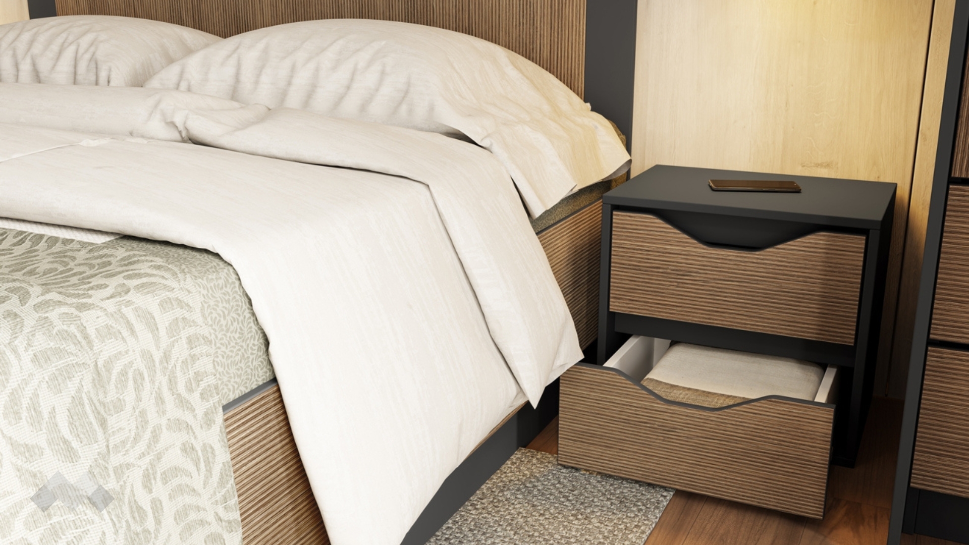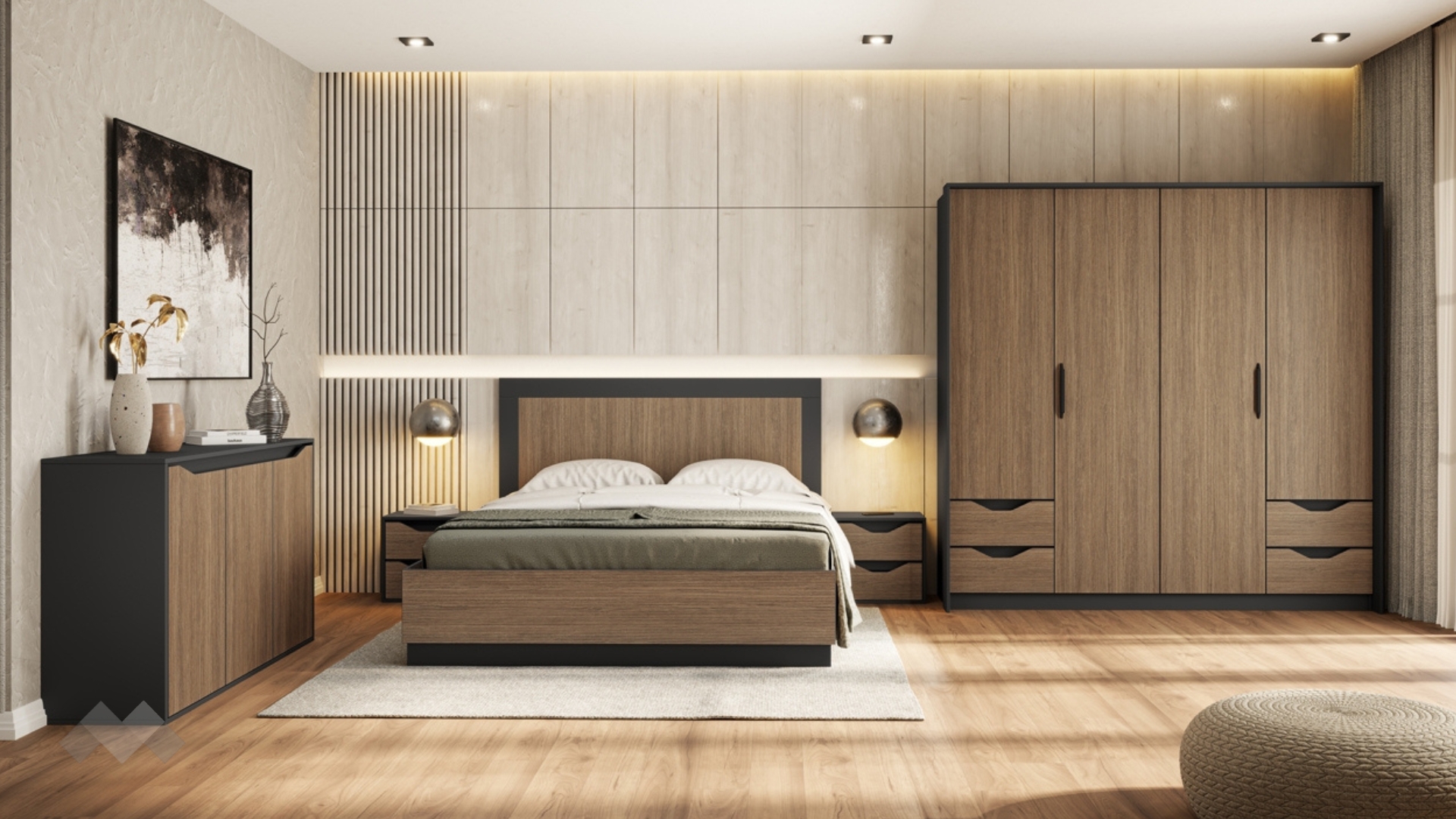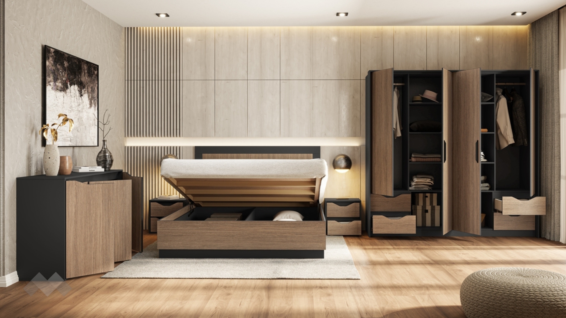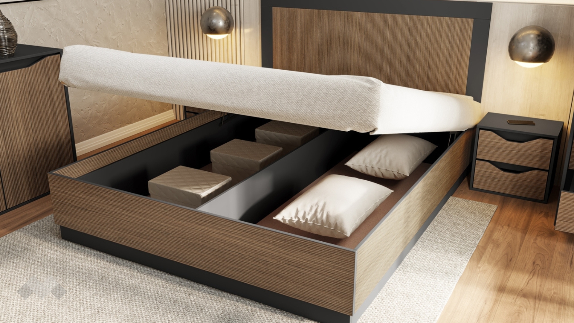 Спалнята е подходяща за матрак 160/200 см. Високата и удобна табла осигурява комфорт при четене или почивка, а подматрачното пространство ти дава дискретно място за съхранение на завивки, спално бельо или сезонни вещи — идеално, когато искаш да поддържаш ред и простор в спалнята.
