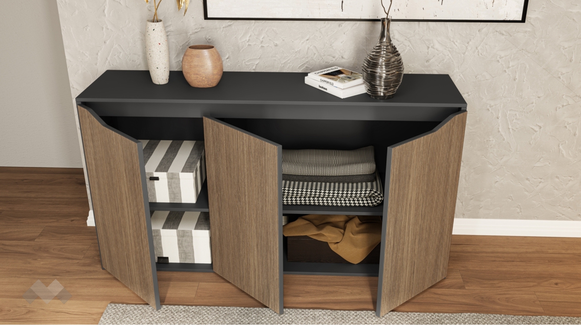 Скринът с два шкафа и три врати допълва комплекта, предоставяйки достатъчно място за съхранение на лични вещи, козметика и други. Зад всяка от вратите има удобен вътрешен рафт, което ще ти осигури оптимално използване на пространството. Плотът отгоре предлага идеално място за подреждане на книги, снимки или любими аксесоари. Ако желаеш да добавиш индивидуален почерк, декорирай с елегантна вазa, свещи или стилна аранжировка.