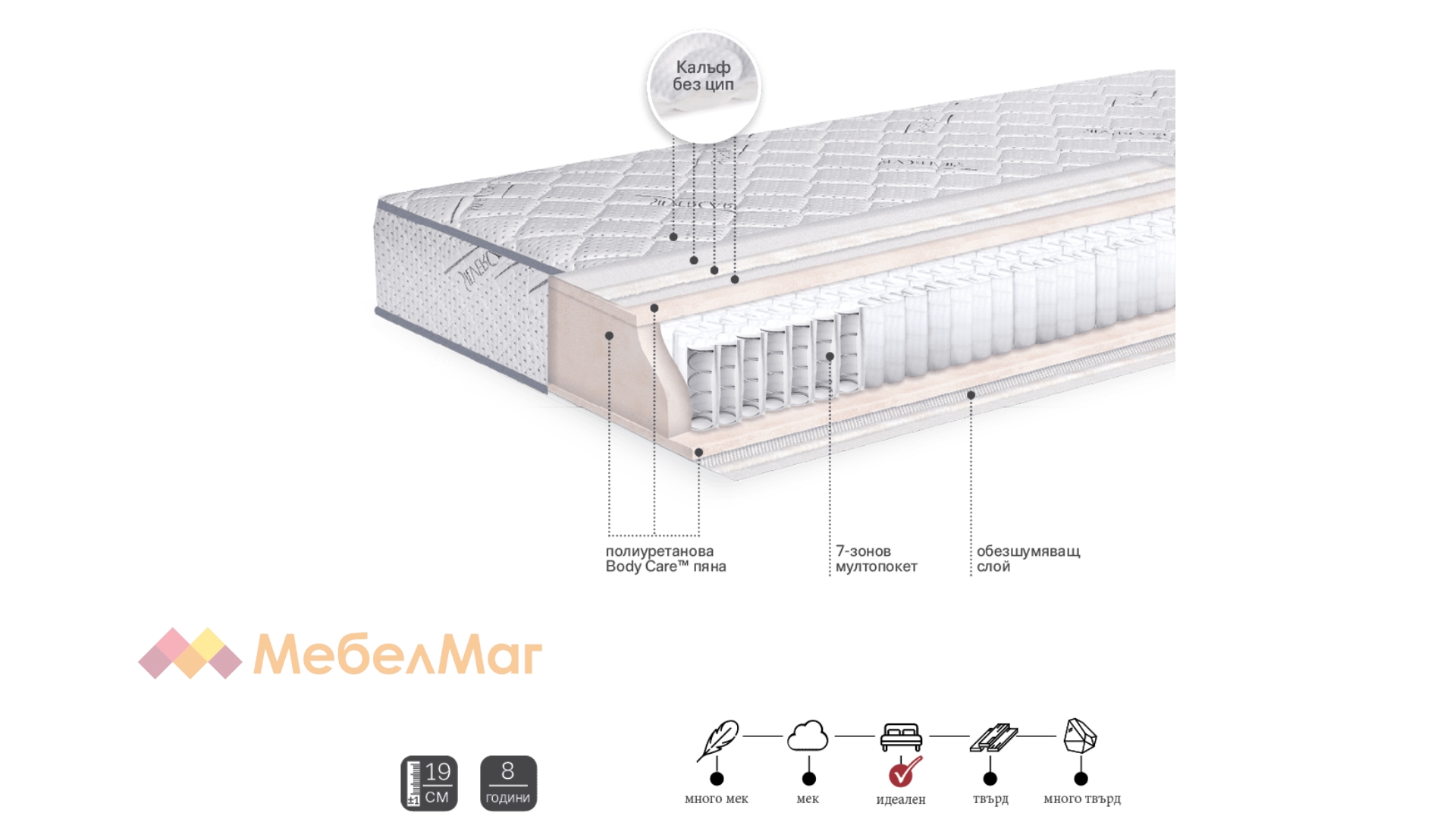 Матракът е с полиуретанова Body Care пяна. Тя придава плътност, еластичност, стабилна опора и поддръжка. Пенополиуретанът е лесен за профилиране, което му придава допълнителни анатомични свойства.