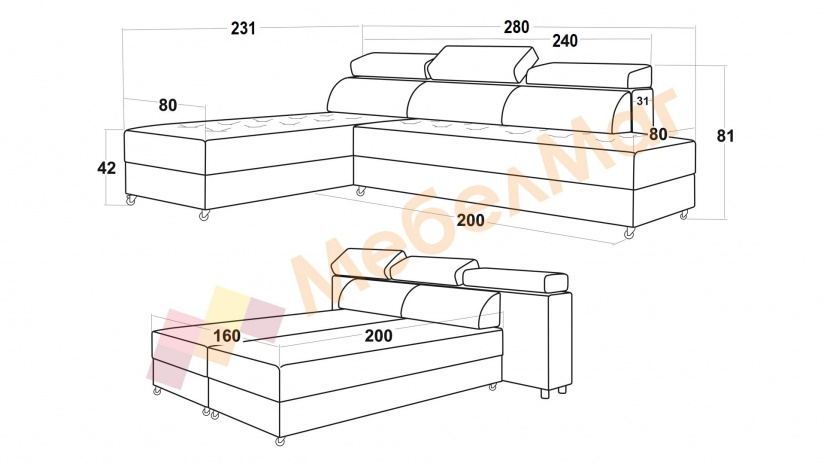 Д: 280 см Ш: 231 см В: 81 см