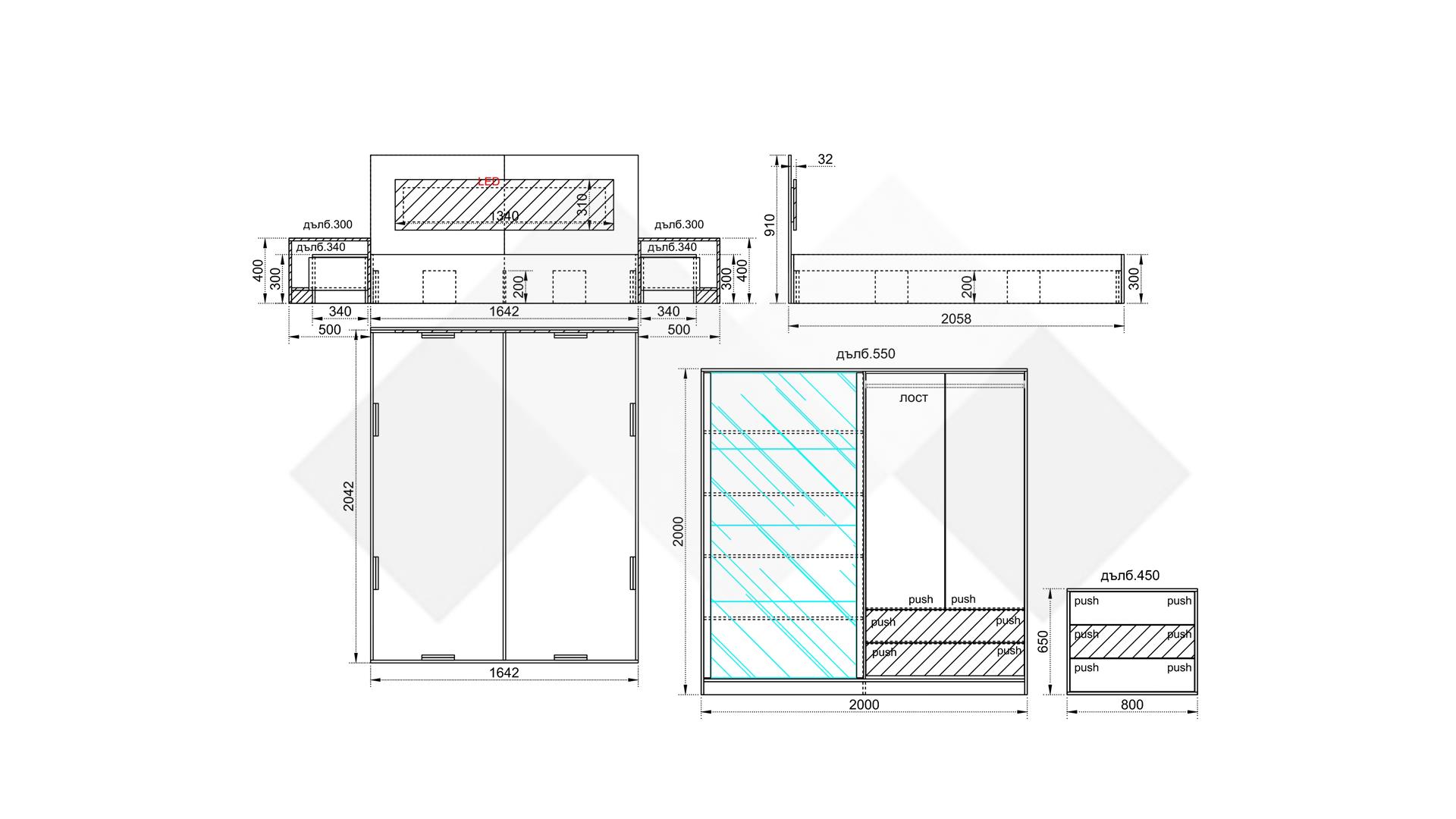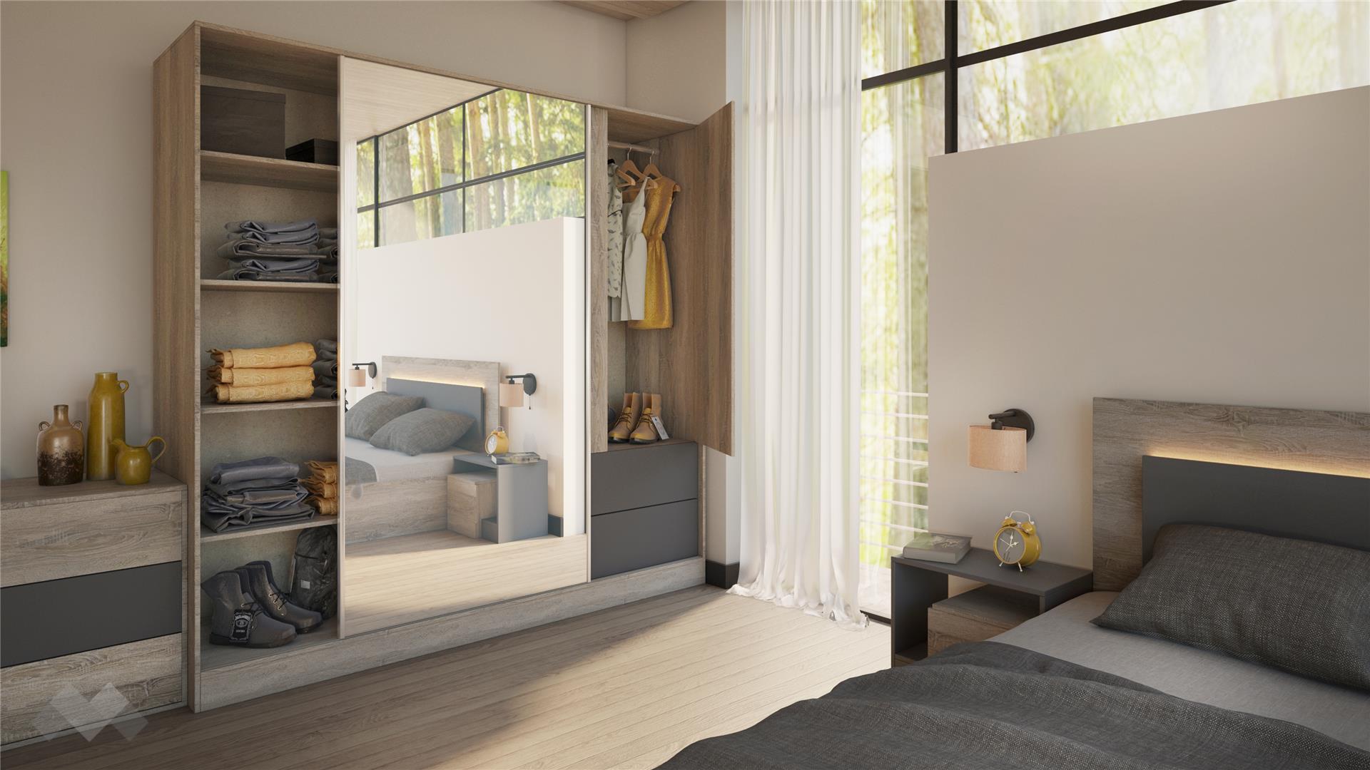 ✓ гардероб с огледало ✓ LED осветление ✓ спалня с нощни шкафчета ✓ скрин ✓ отваряне с пуш бутони ✓ 16 мм ПДЧ