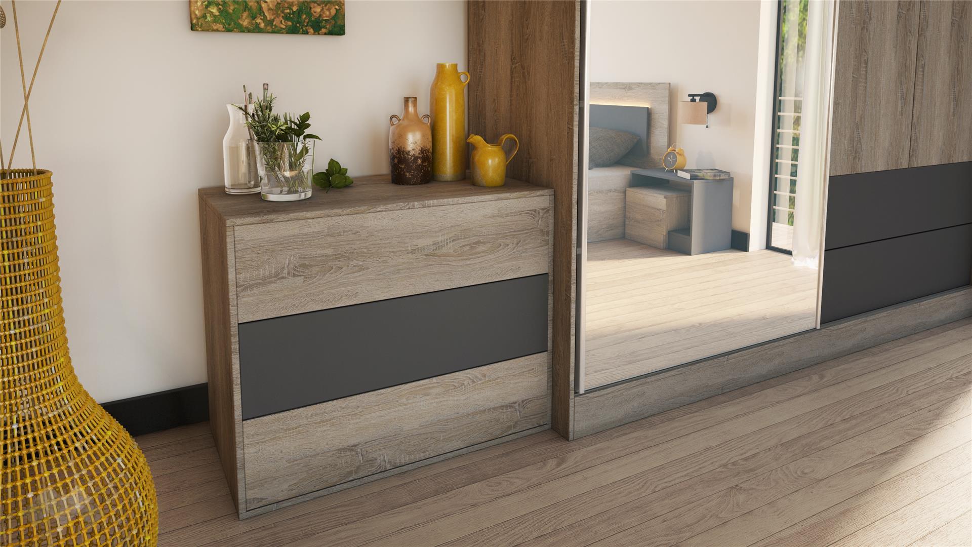 Спален комплект Елза умело съчетава класическата тъмна сонома с модерния графит, за да получиш елегантна спалня с модерни нотки.