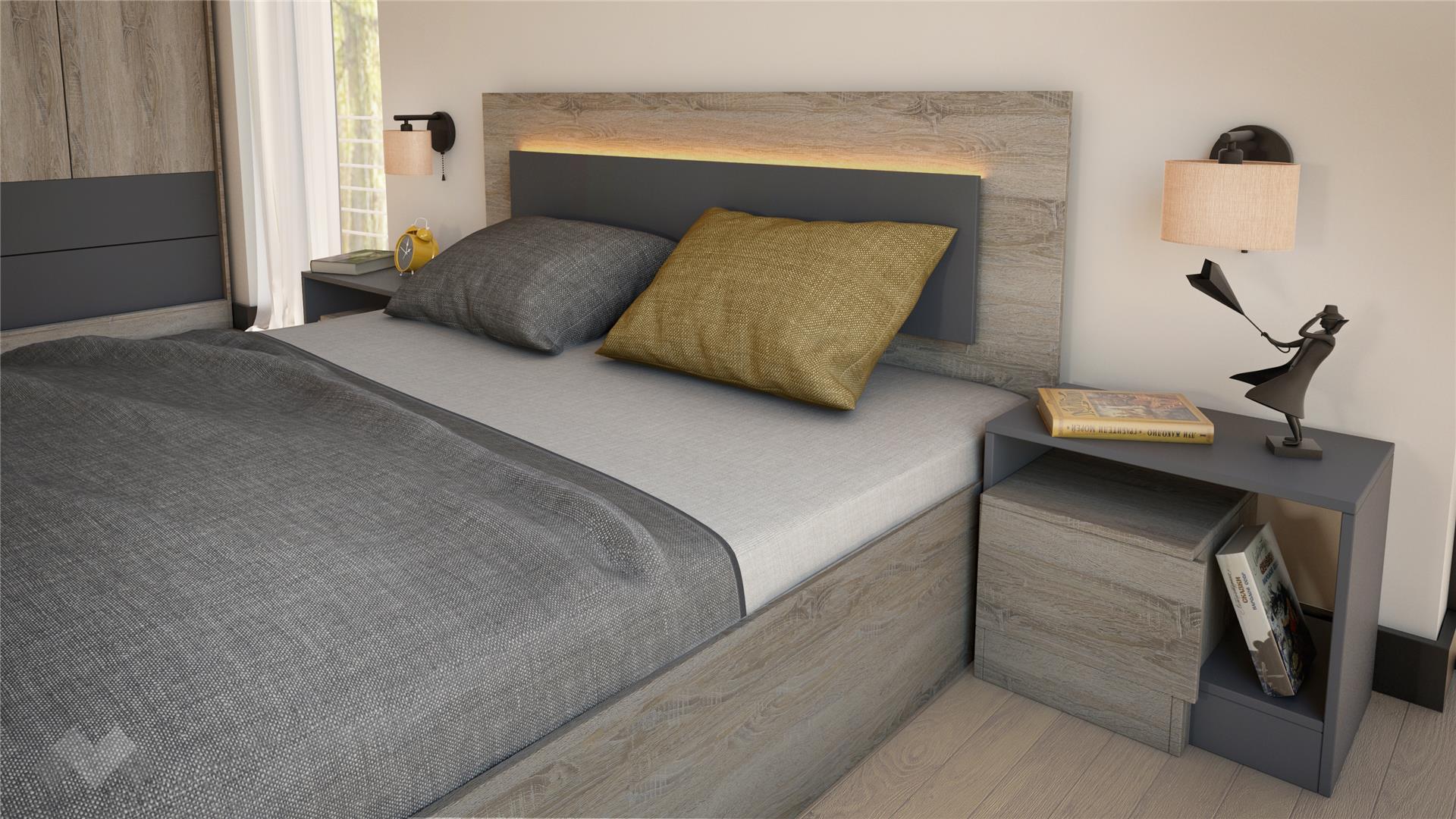 Таблата на спалнята е ефектно декорирана с акцент в цвят графит. Включеното LED осветление на таблата, което освен, че придава модерен завършек, осветява дискретно зоната около леглото и е много удобна екстра, ако ставаш нощем, а не искаш да светваш и будиш половинката си.