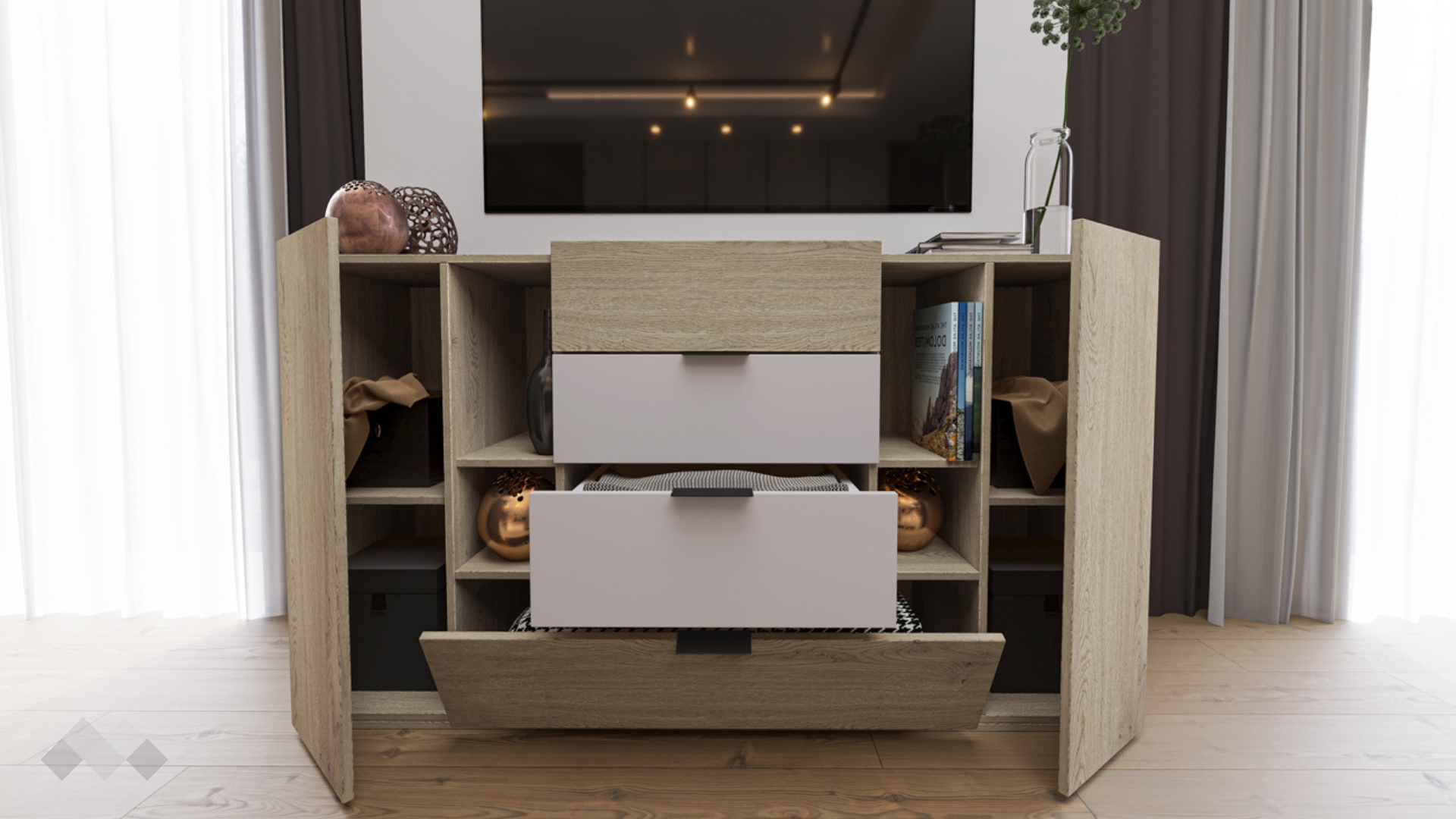 Снабден е с три чекмеджета за подредба на по-дребни вещи и три шкафа, които осигуряват допълнително пространство за принадлежности. Широкият шкаф разположен отдолу е с падаща врата и е удобен за съхраняване на по-обемни вещи. Зад всяка от двете врати със странично отваряне има удобен вътрешен рафт, който помага за оптимална организация на пространството.