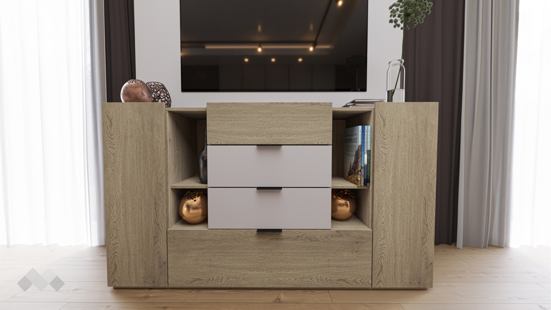 Скринът е снабден  с три чекмеджета за подредба на по-дребни вещи и три шкафа, които осигуряват допълнително пространство за принадлежности. Широкият шкаф разположен отдолу е с падаща врата и е удобен за съхраняване на по-обемни вещи. Зад всяка от двете врати със странично отваряне има удобен вътрешен рафт,който помага за оптимална организация на пространството.