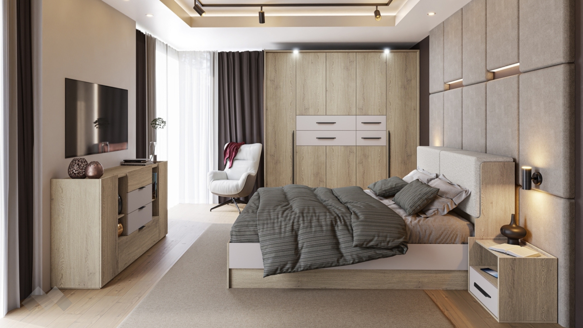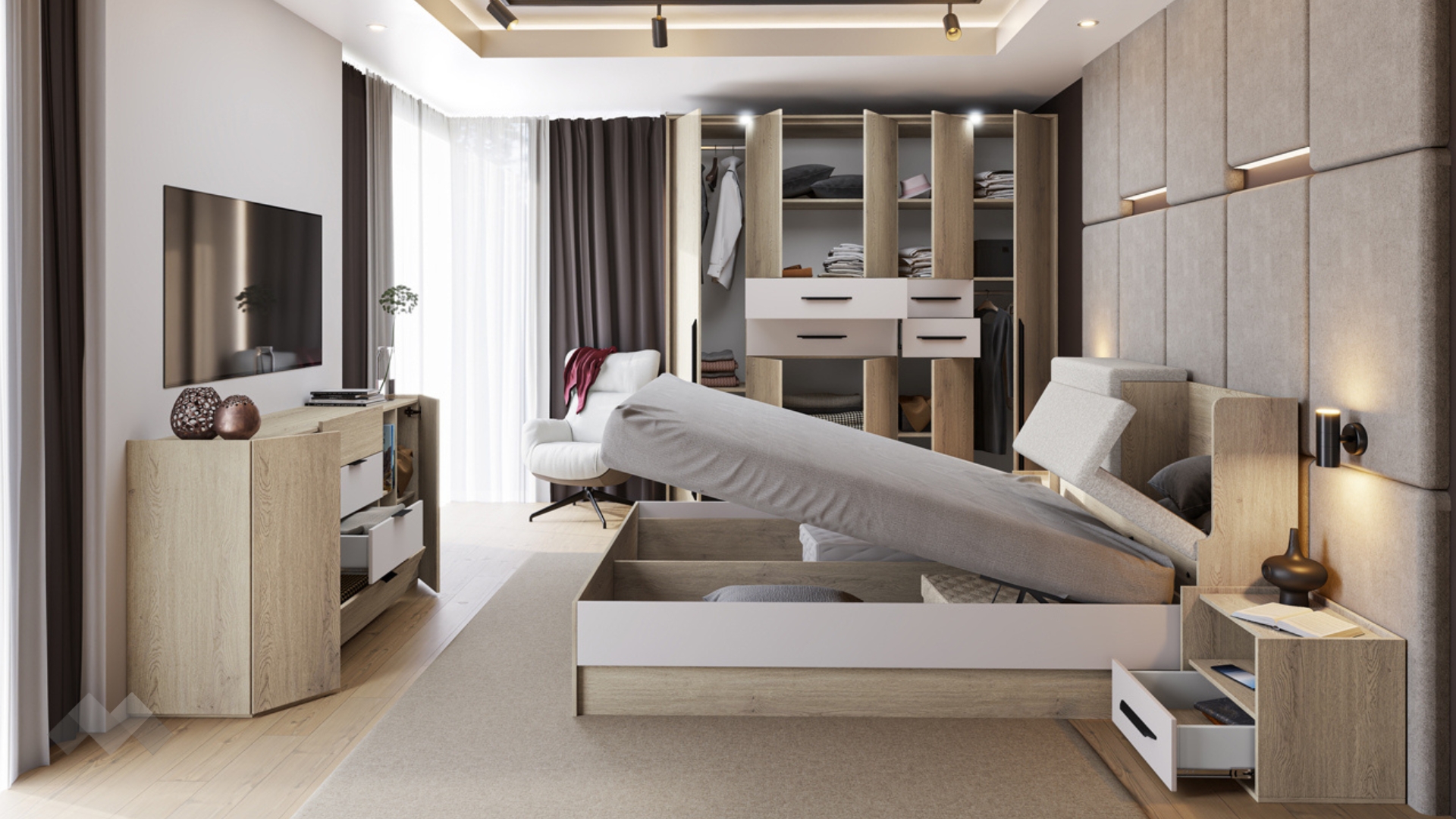 Спалнята е подходяща за матрак 160/200 см. Високата и удобна, тапицирана в светъл цвят табла ще ти осигури нужния комфорт при четене или почивка. Тя крие малка изненада – две практични вградени ракли,една за теб и една за половинката. Така всеки има своето място за завивки и възглавници, без битки за пространство.