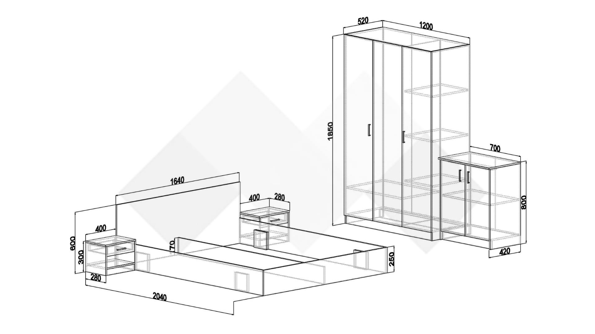 Нощно шкафче (2 бр.): Д: 40 см Ш: 28 см В: 30 см