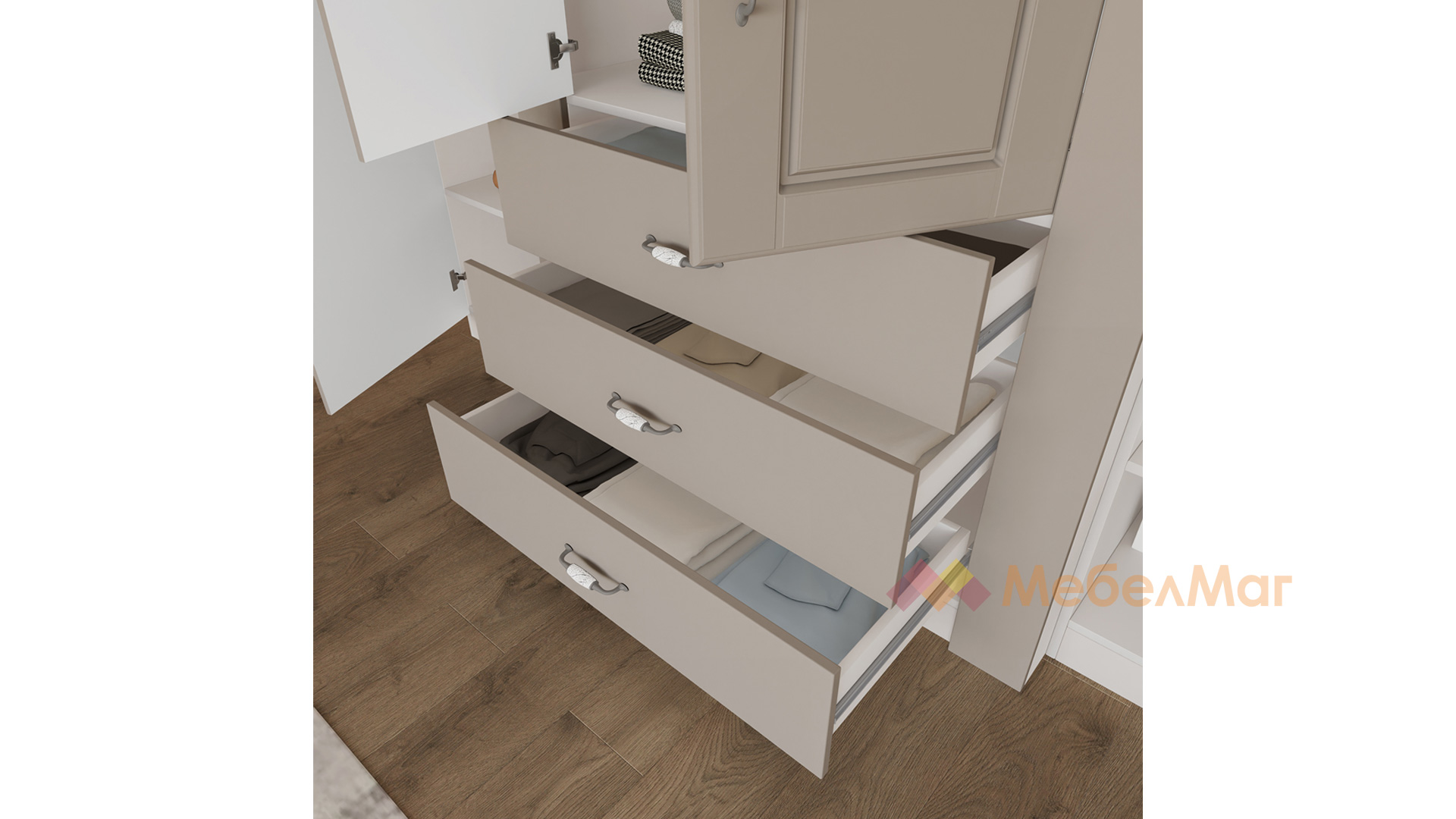 Той ще те впечатли с функционално разпределение, което ще ти позволи да подредиш под конец всички дрехи и аксесоари. На твое разположение са цели девет рафта за организиране на сгънати дрехи, хавлии, завивки, аксесоари и кутии за съхранение. Трите лоста за закачалки ти дават възможността да закачиш прилежно елегантното си облекло като рокли, ризи, сака и връхни дрехи. За още по-голямо удобство разполагаш и с три просторни чекмеджета, подходящи за съхранение на бельо, чорапи или дребни принадлежности.