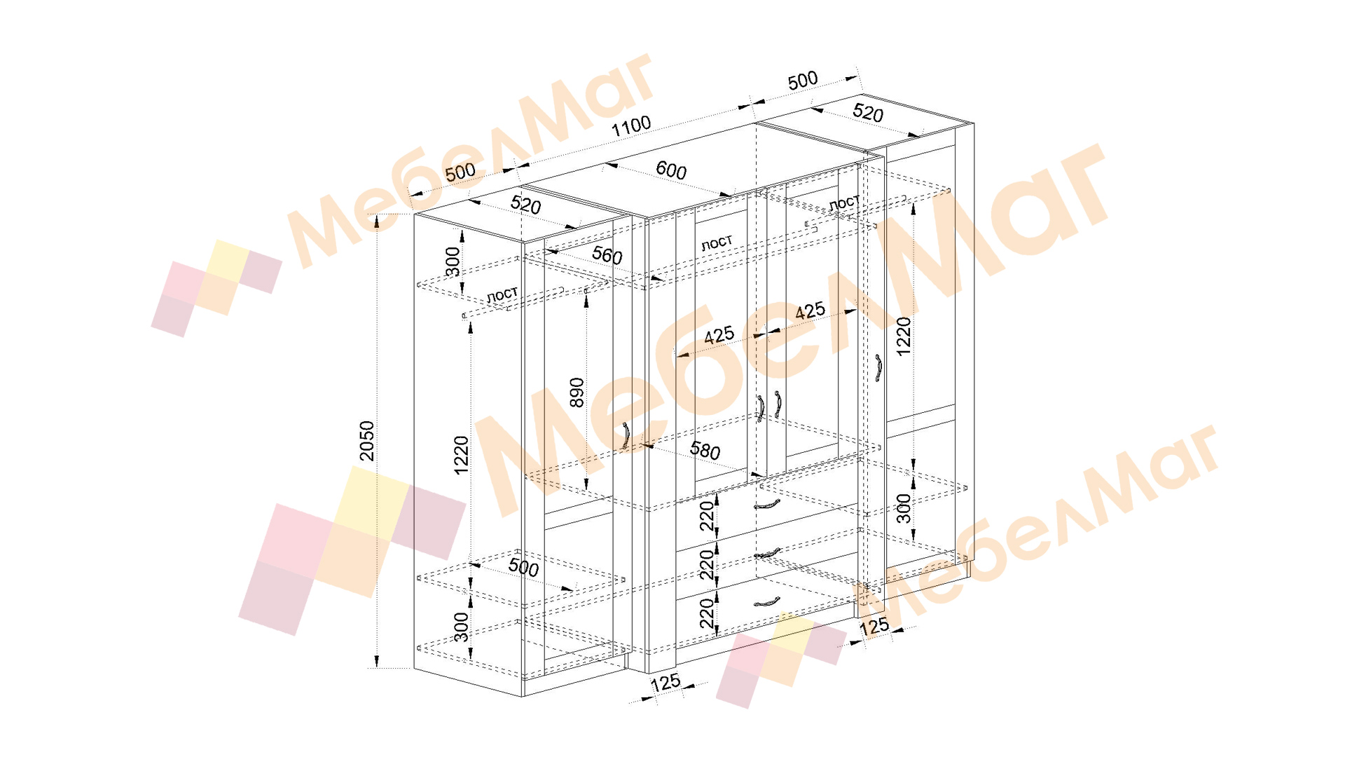 Конструкцията на четирикрилен гардероб Еридан е изпълнена от 16 мм ПДЧ в комбинация с 18 мм МДФ, което гарантира здравина и устойчивост.