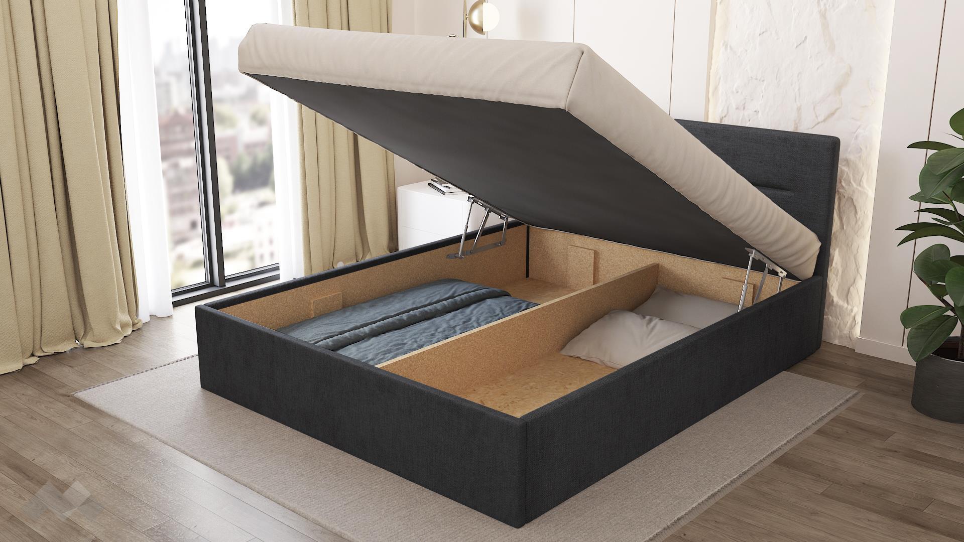 Тапицирана спалня Фиорела е с идеалните размери – подходяща е за матрак с размер 160/200 см. С повдигането на матрака пък се открива широко пространство, готово да побере всички възглавници и завивки, на които все не се намира място. Допълнителният делител на подматрачното пространство прави организацията на вещите още по-лесна.