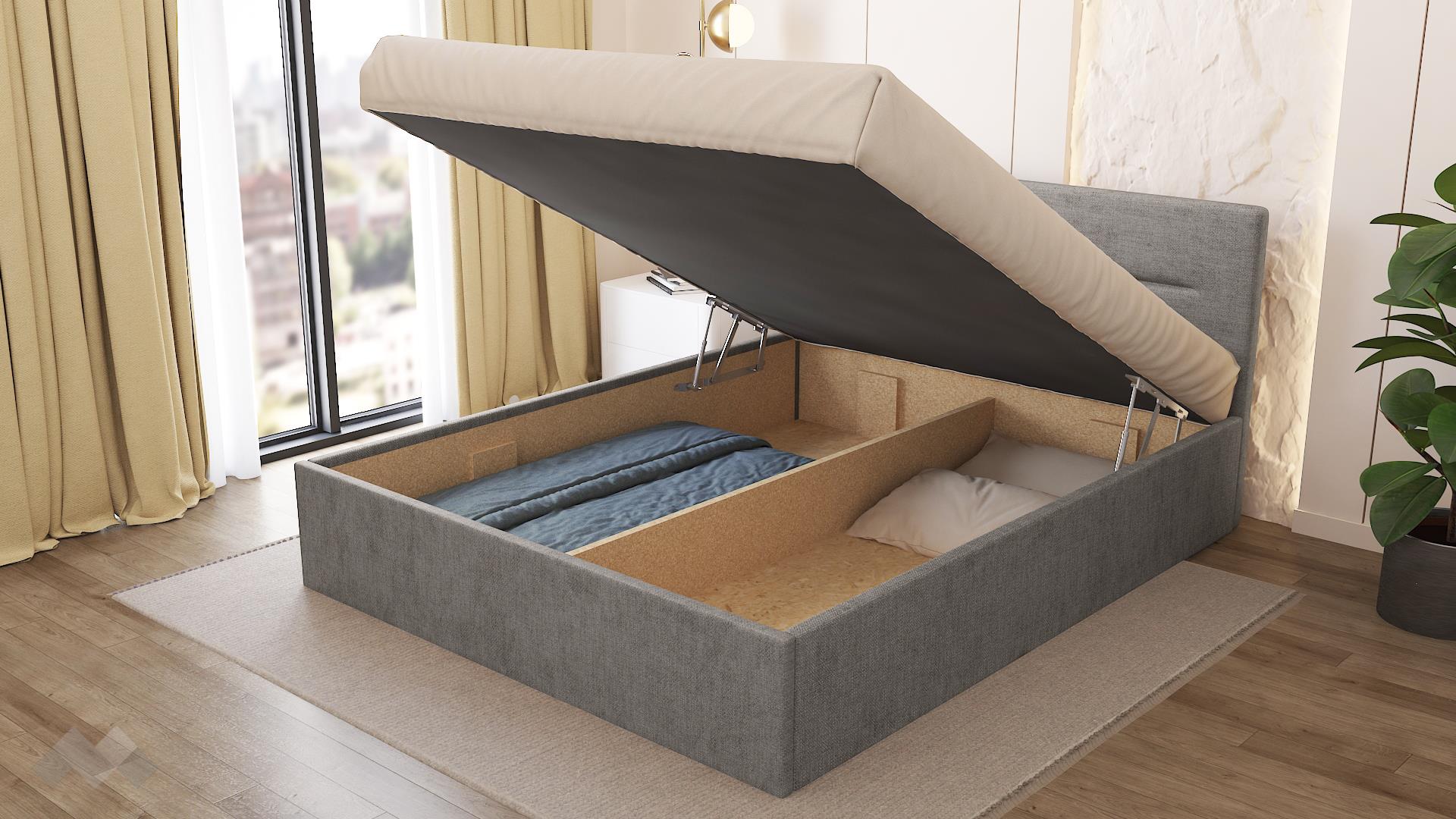 Тапицирана спалня Фиорела е с идеалните размери – подходяща е за матрак с размер 160/200 см. С повдигането на матрака пък се открива широко пространство, готово да побере всички възглавници и завивки, на които все не се намира място. Допълнителният делител на подматрачното пространство прави организацията на вещите още по-лесна.