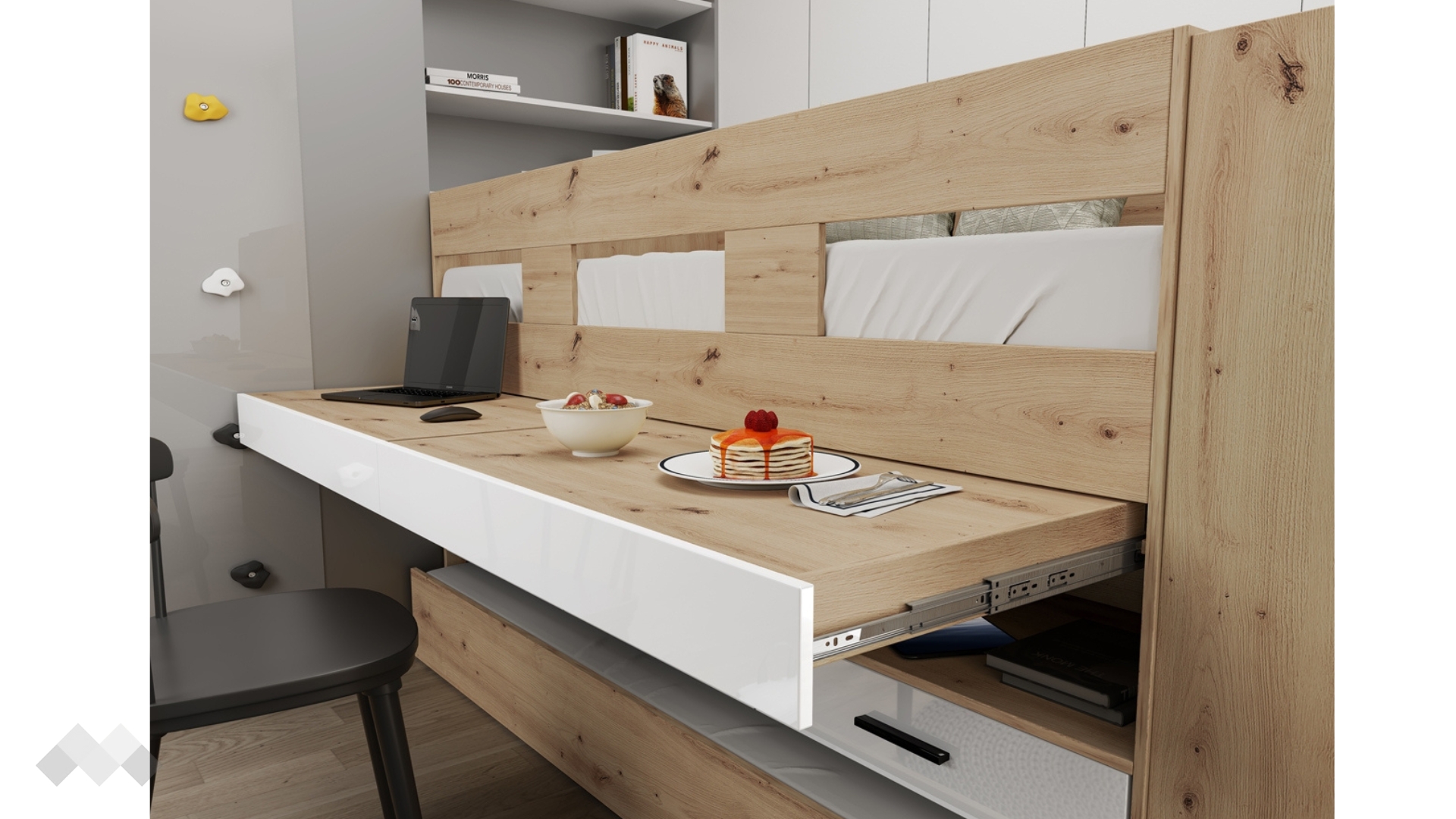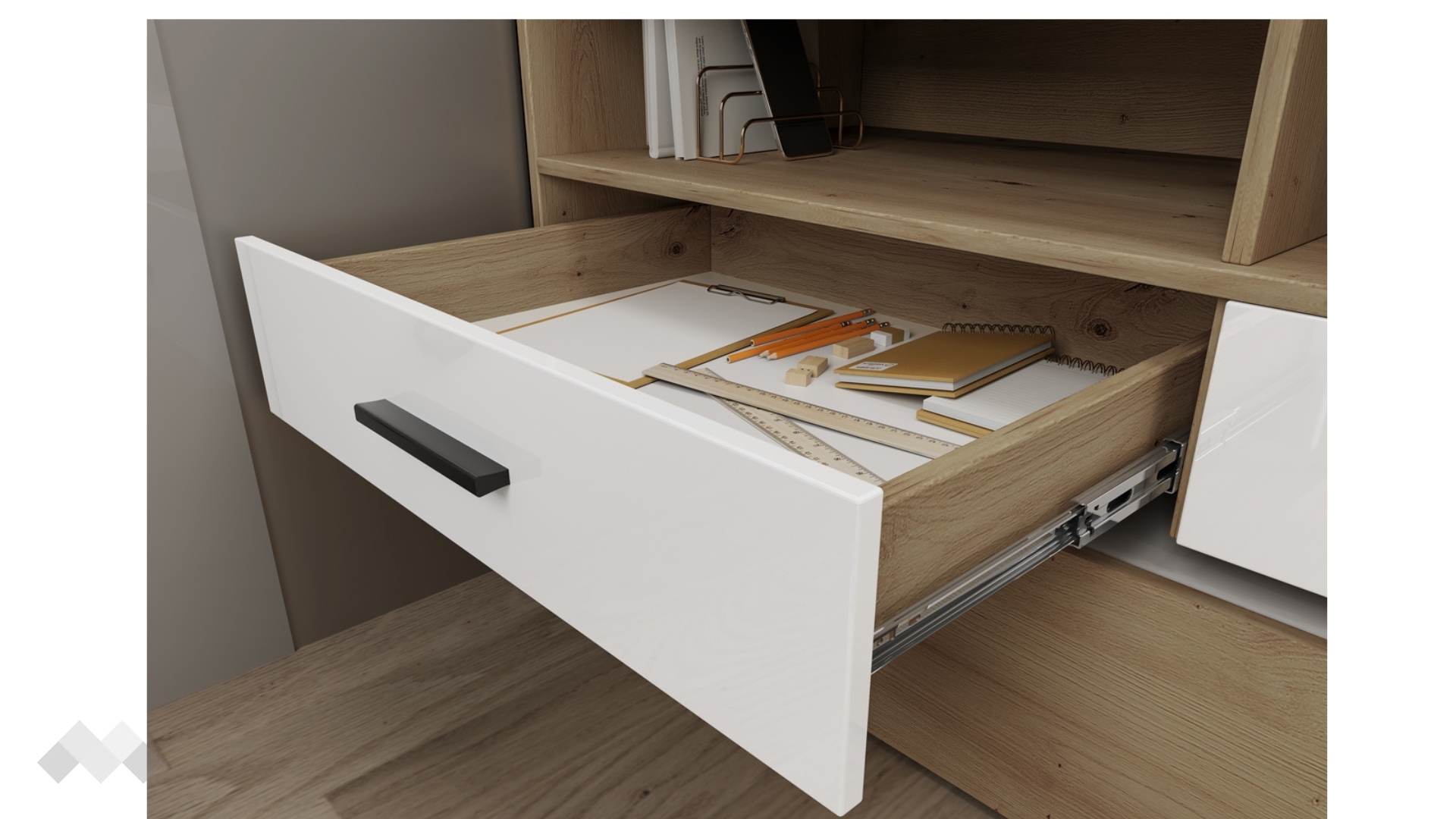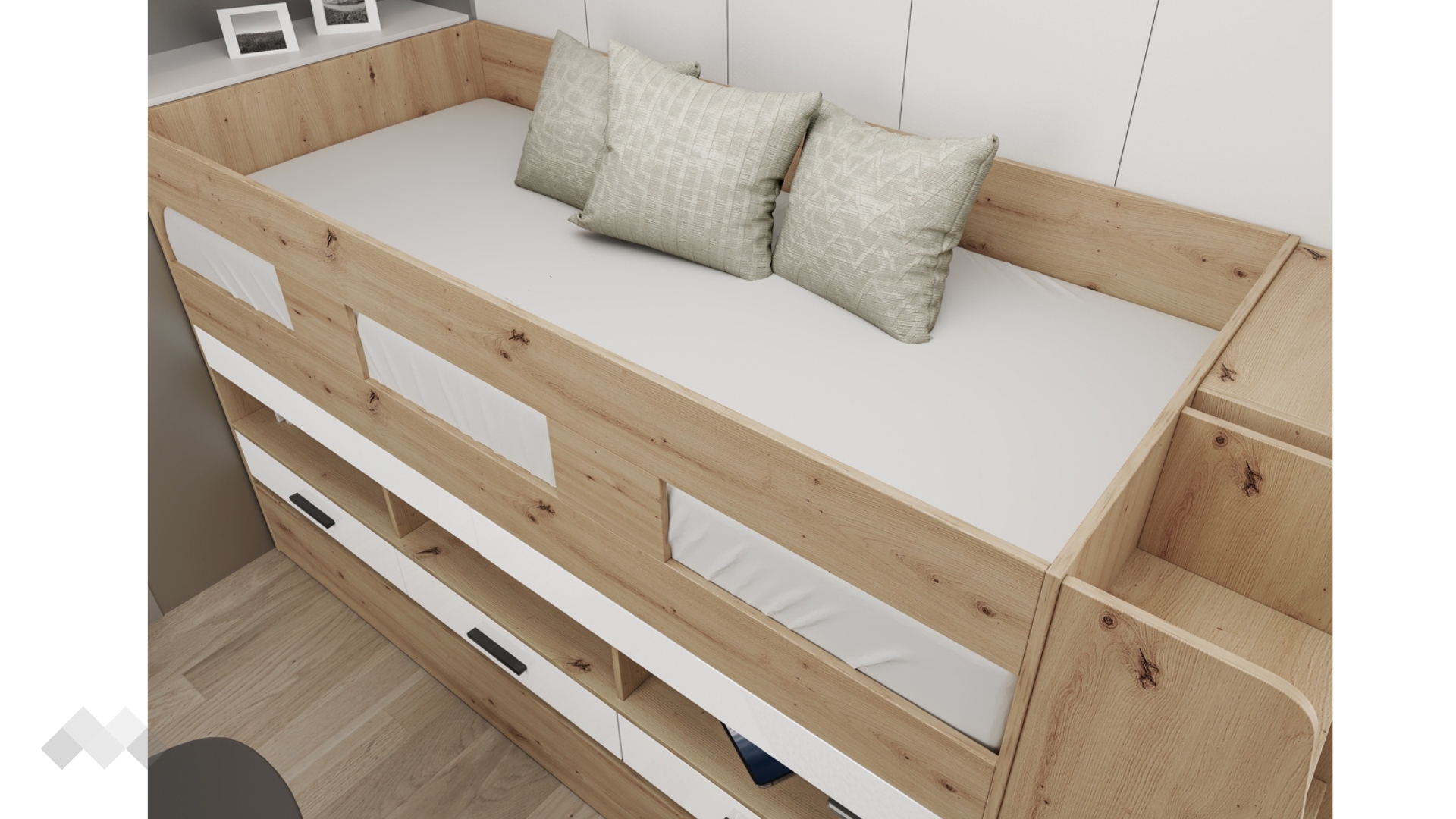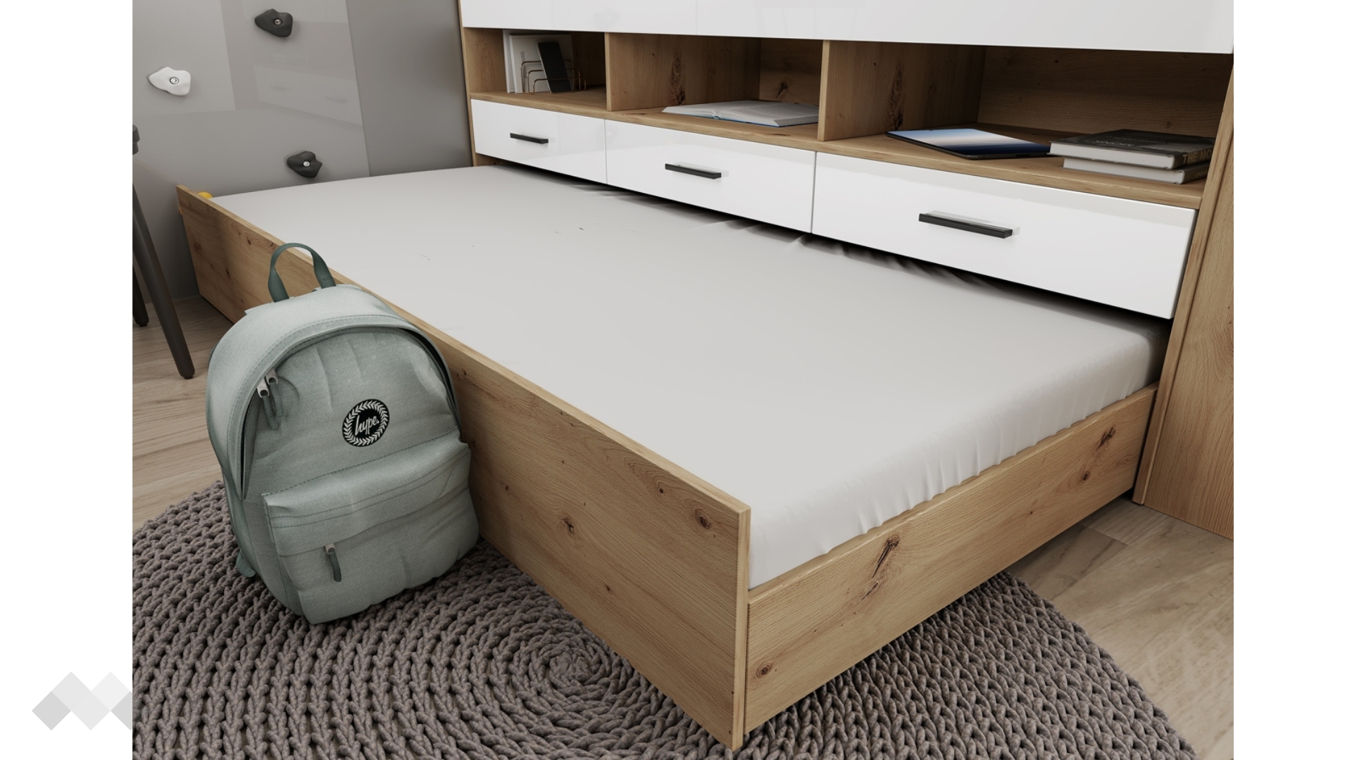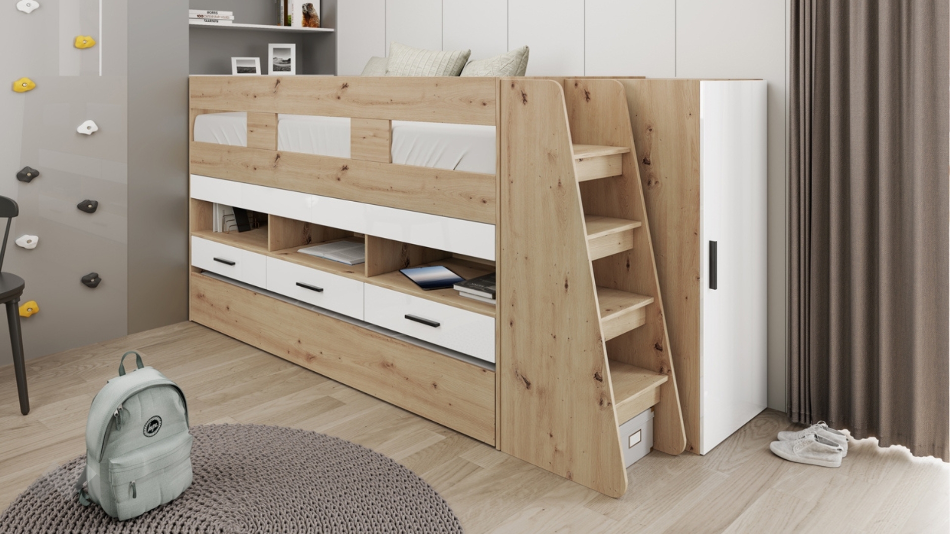 Леглото разполага още с три чекмеджета и три отворени ниши, идеални за учебници, играчки и лични вещи. Чекмеджетата са снабдени със сачмени водачи с плавно затваряне, осигуряващи комфорт и тиха употреба.