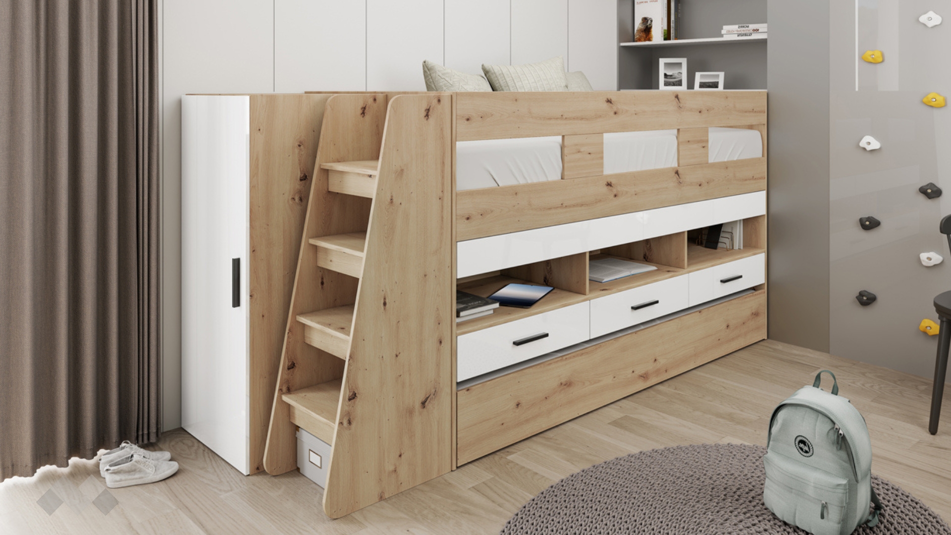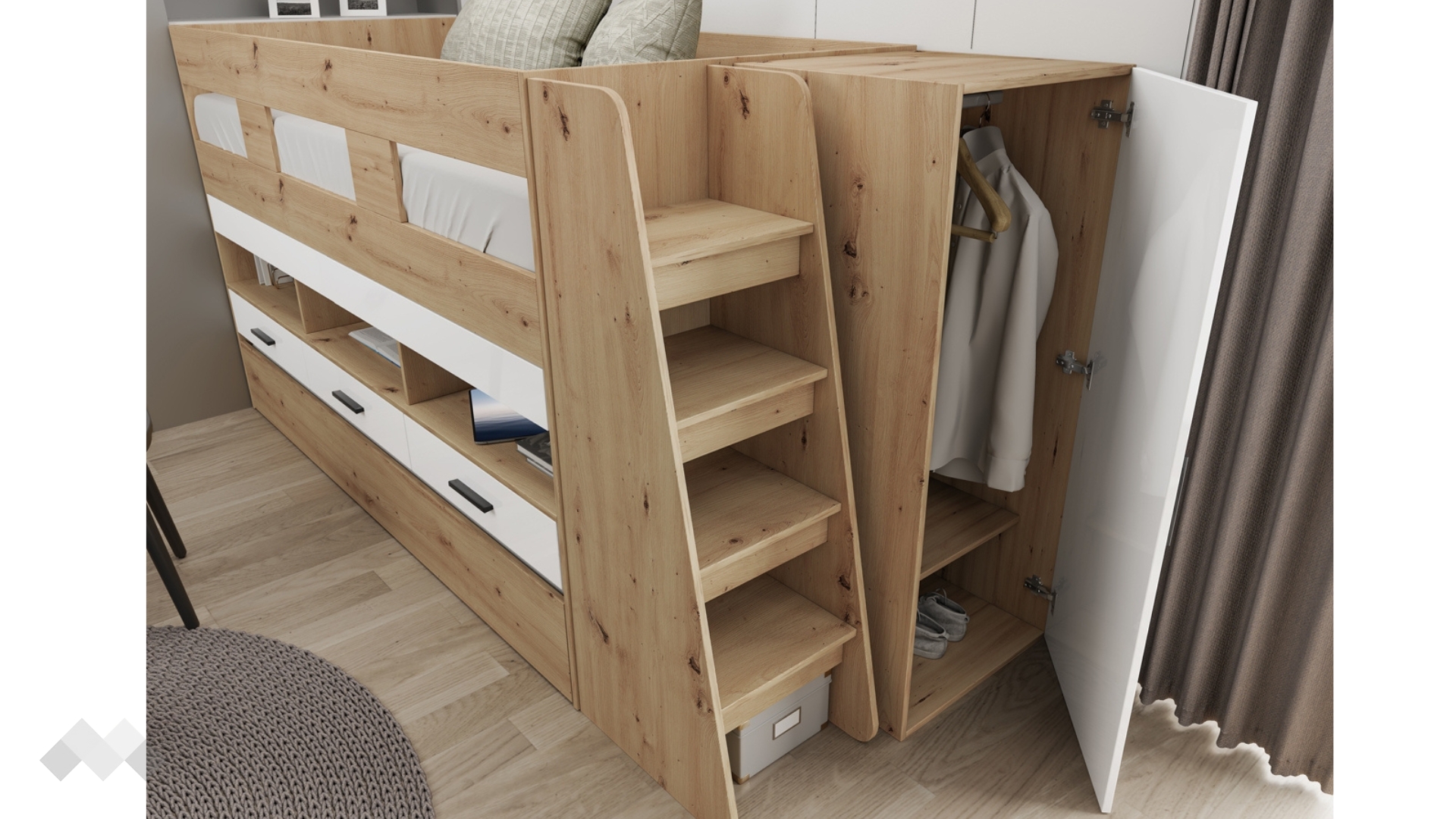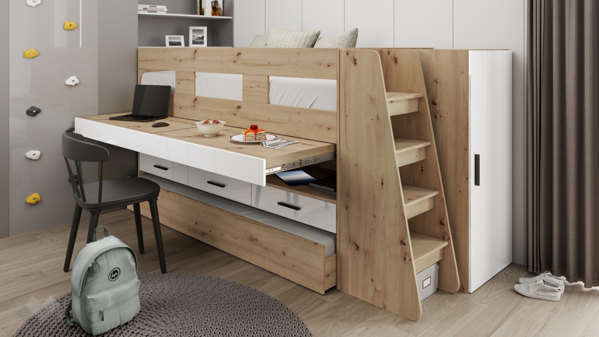 ⭐ Предимства: ✓ необходимо е използване само с еднолицеви матраци до 23 см височина ✓ долното легло е на колелца и се издърпва напред ✓ за матраци 90/200 ✓ прибиращо се бюро - 2 плота ✓ 3 чекмеджета ✓ 3 отворени ниши ✓ гардероб ✓ стълба с рафтове ✓ високи табли ✓ модерен декор ✓ качествена изработка ✓ 16 мм ПДЧ