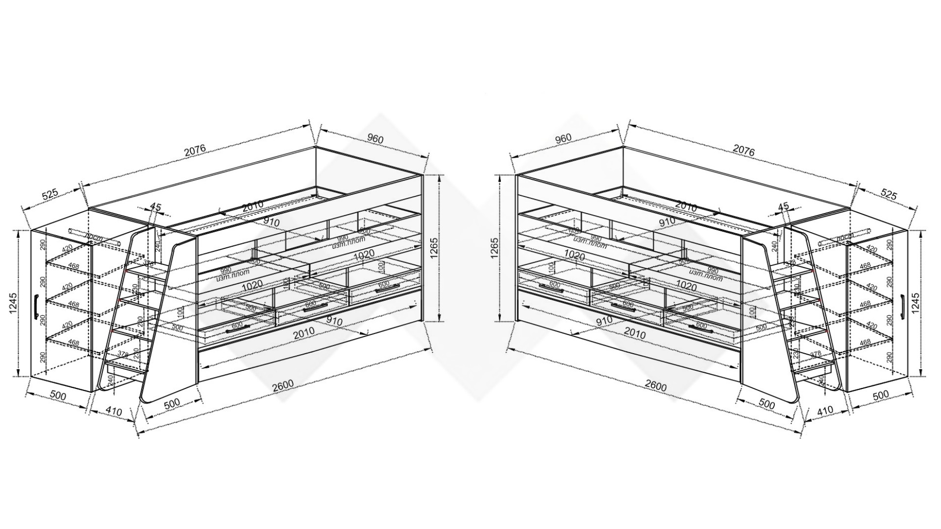 Леглото предлага универсална посока на сглобяване – стълбата с рафтове и гардеробът могат да бъдат монтирани по твое желание отляво или отдясно. Освен това гардеробът позволява монтаж с ляво или дясно отваряне на вратата, в зависимост от разположението в стаята.
