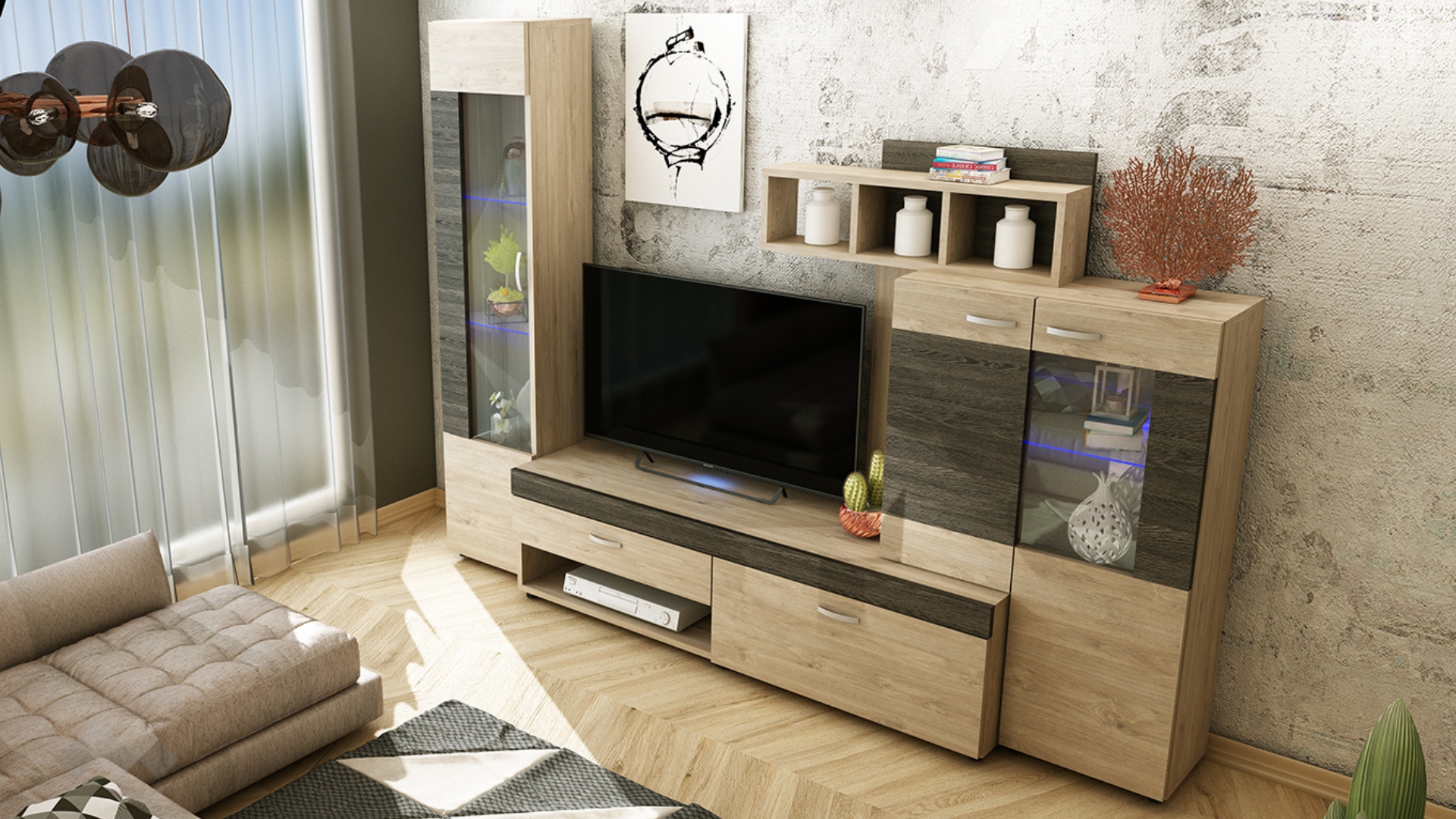 Секцията разполага с висок витринен шкаф – там ще намерят място всичките ти красиви сервизи, любими сувенири или стилни декорации. Допълнителното синьо LED осветление ще акцентира още повече върху тях и ще ги накара да засияят, благодарение на това няма как да убегнат от погледите на гостите ти. ТВ шкафа предлага достатъчно пространство, където да поставиш цялата си съпътстваща техника като ТВ приемници, DVD плейъри и други. Можеш да ги организираш, където пожелаеш - в затворено шкафче, чекмедже или една отворена ниша. До него се намира още един голям шкаф, в който можеш да прибереш по-обемни вещи, ел. уреди или други необходими вещи, а в остъклената му част ще намериш още място за неща, които не искаш да останат скрити. Към шкафа също е включено синьо LED осветление.