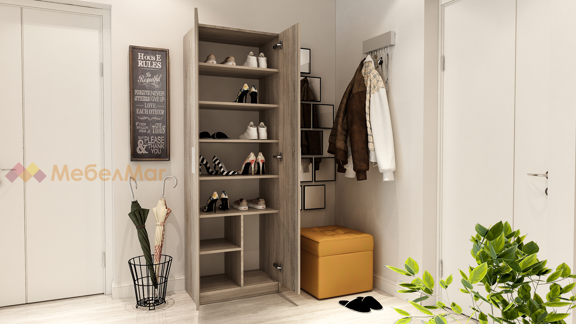 Шкаф за обувки Гилбърт е с функционално разпределение и събира до 20 чифта обувки, като е подходящ и за по-високи модели. Вратите са с панти с плавно затваряне. Произведен е от висококачествено 16 мм ПДЧ с меламиново покритие и PVC кант.