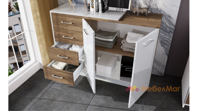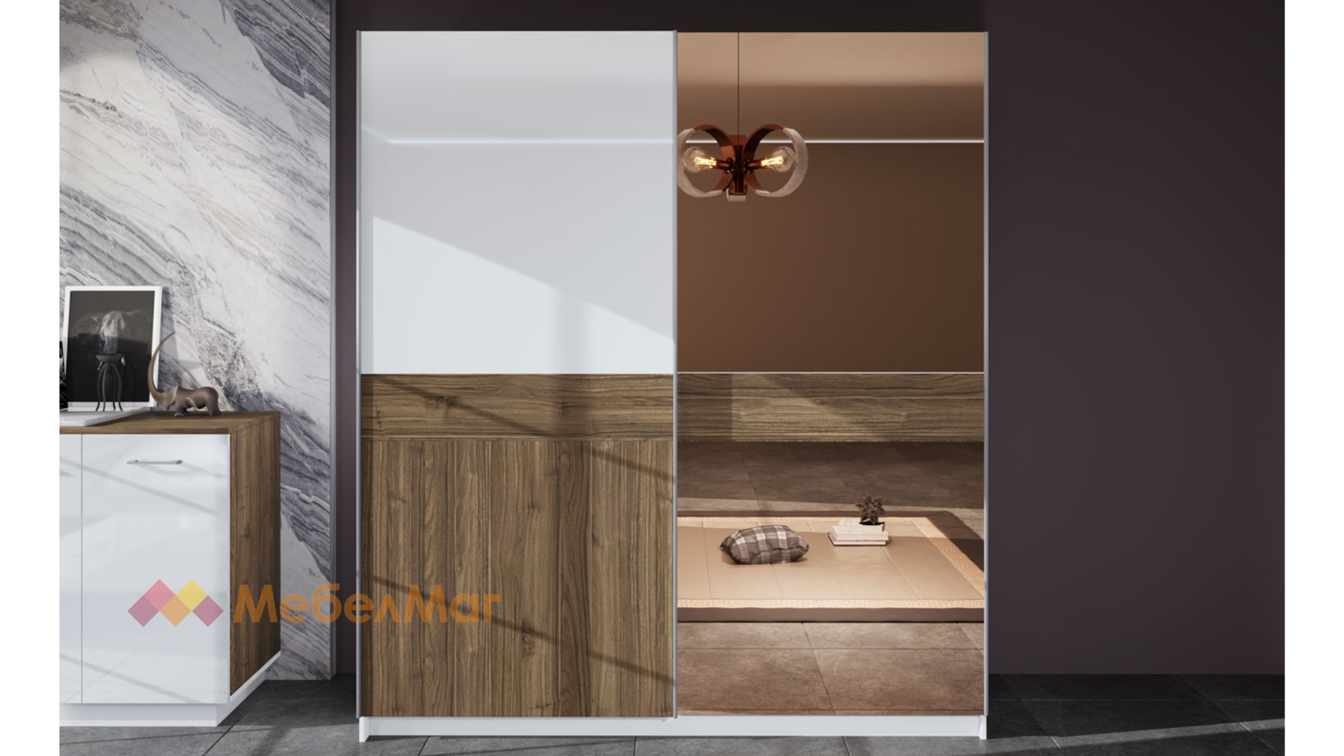 Гардеробът е двукрилен с плъзгащи врати. Пространството е разпределено между четири рафта и два лоста за закачалки. Така всички твои дрехи ще са съхранени по най-качествения начин и ще са готови да ги облечеш при нужда.