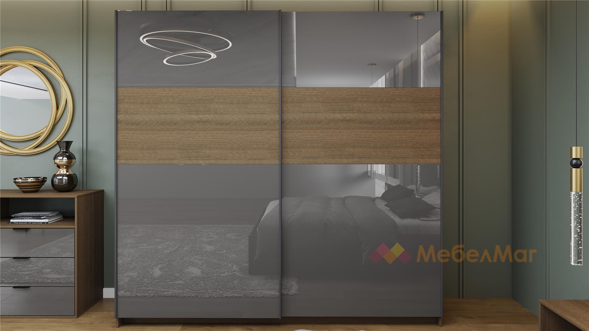 Гардеробът с плъзгащи врати е по-голям и с дължина 220 см, предоставяйки още повече място за съхранение. Той предлага отлично вътрешно разпределение с рафтове, лостове за закачалки и място за дребни аксесоари. Огледалото на вратите добавя практичност и визуално разширява помещението, а дискретните кант-дръжки с минимално надстърчане подчертават изчистения му стил.