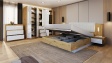 Освен с изискания, стилен и модерен външен вид, моделът може да се похвали с много удобства. Спалнята е конструирана с мисъл за теб и твоя комфорт. Просторна за спокоен нощен сън, спалнята е подходяща за матрак с размери 160/200. Към нея се монтират стилни нощни шкафчета, които са разположени на нивото на спалнята. Вграденото тъч LED осветление в таблата на леглото над нощните шкафчета елиминира необходимостта от допълнителна нощна лампа. Тапицираната табла с кожа и контрастен шев създава усещане за лукс и стилно обзаведен дом. Леглото е с високи лубове, които осигуряват удобна височина за сядане – 46-48 см с матрака.