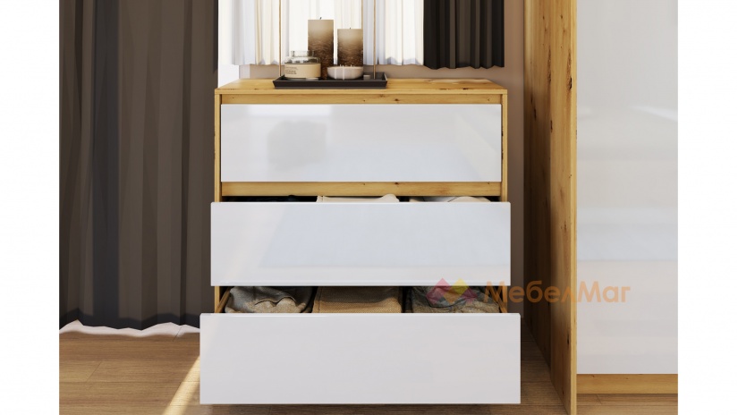 Спален комплект Хало включва и елегантен скрин с три големи чекмеджета, който ти предоставя още място за съхранение на лични вещи. Той е изчистен, семпъл и перфектно допълва останалите мебели в комплекта. Чекмеджетата на скрина също са с телескопични водачи.