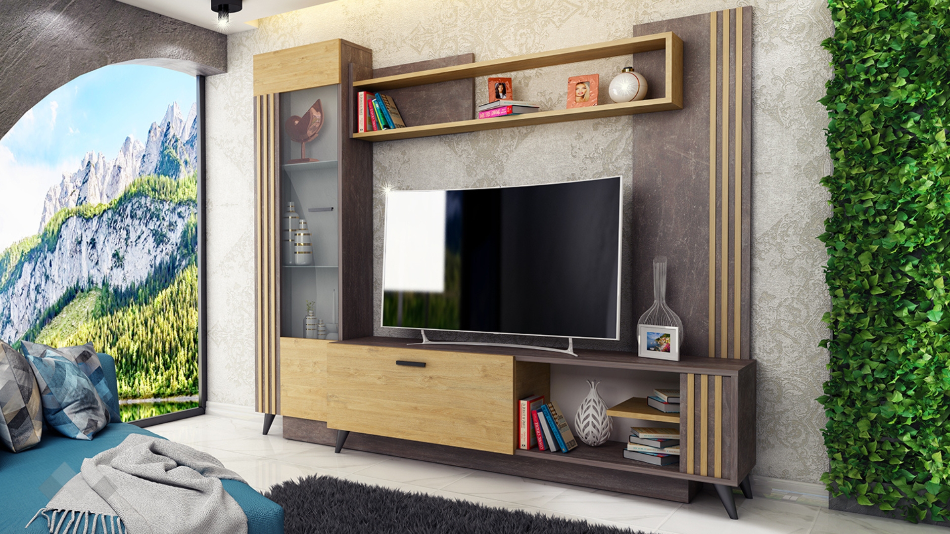Благодарение на множеството отворени и затворени пространства за съхранение на вещи, секция Хана ти предлага функционалност, която може да ти бъде от огромна полза. В основата има плот за телевизор, един просторен затворен шкаф и един отворен шкаф - достатъчно място за твоите ТВ приемници, DVD плейъри или друга техника. От лявата страна е долепен витринен шкаф със стъклена вратичка, подходящ за съхранение на всичките ти красиви сервизи, съдове или други вещи. Над мястото за телевизор е разположен широк отворен шкаф, който е идеален за любимите ти сувенири, фотоси, книги и декорации.