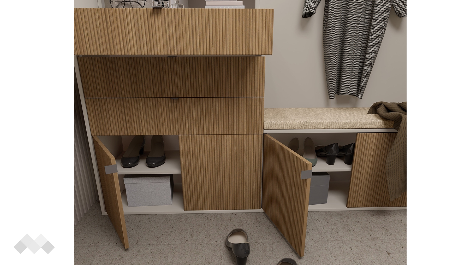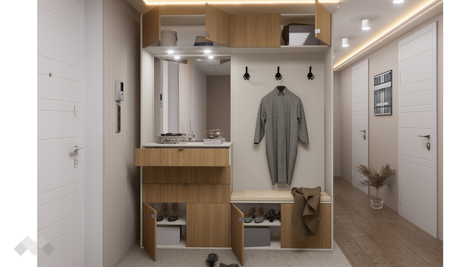 Портманто Хармония е стилно и функционално решение за твоето антре, което съчетава модерен дизайн и отлично организирано пространство за съхранение. То ще ти помогне да поддържаш ред още от входа на дома, като осигурява удобно място за връхни дрехи, обувки и аксесоари.