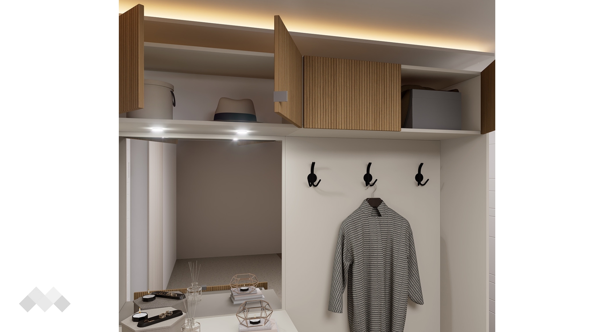 Огледалото е елегантен акцент, внасящ усещане за простор и светлина в помещението, като в същото време ти дава възможност да се огледаш преди излизане. Под него, върху практичния плот, можеш да подредиш козметика или декоративни елементи, които ще придадат индивидуалност на антрето. За допълнителен комфорт и модерна визия, моделът разполага и с вградено LED осветление.