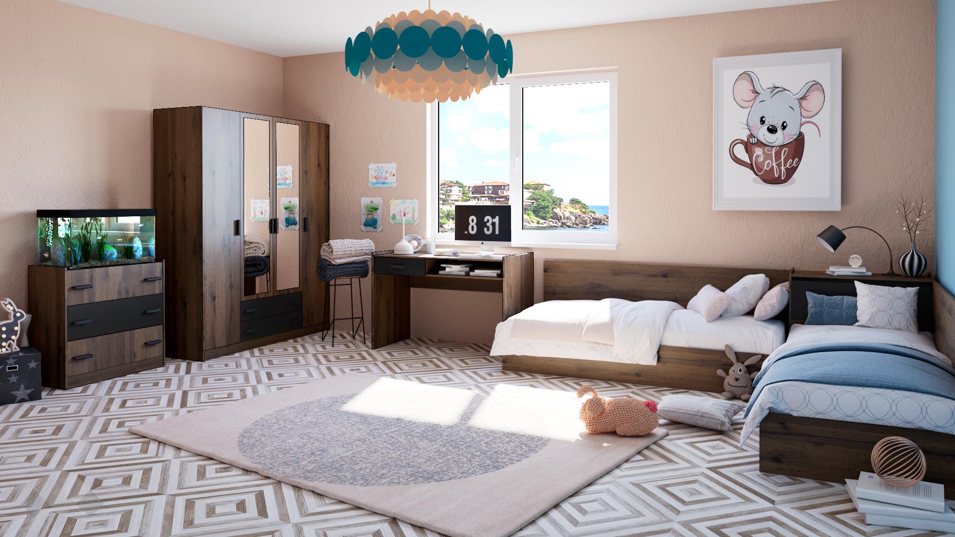 Различното в декора и материала на тази серия мебели е WNR меламиновото покритие - то не е гладко, а е с дървесна, релефна структура, имитираща и доближаваща се максимално до истинско дърво. Това прави тези мебели да изглеждат ефектни и невероятни. Конструкцията на скрина е изпълнена от устойчиво ПДЧ с дебелина 16 мм, здраво и лесно за поддръжка. Прецизната изработка и висококачественият обков гарантират дълготрайна употреба на скрина, а за теб остава да се насладиш на своя красив и подреден дом.