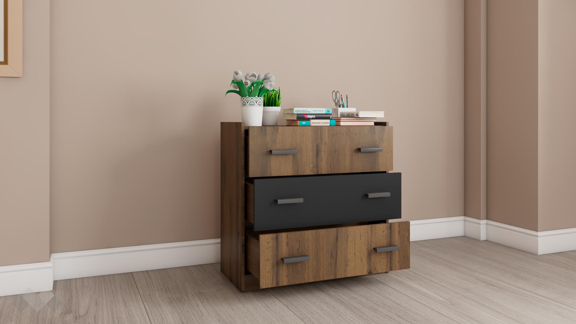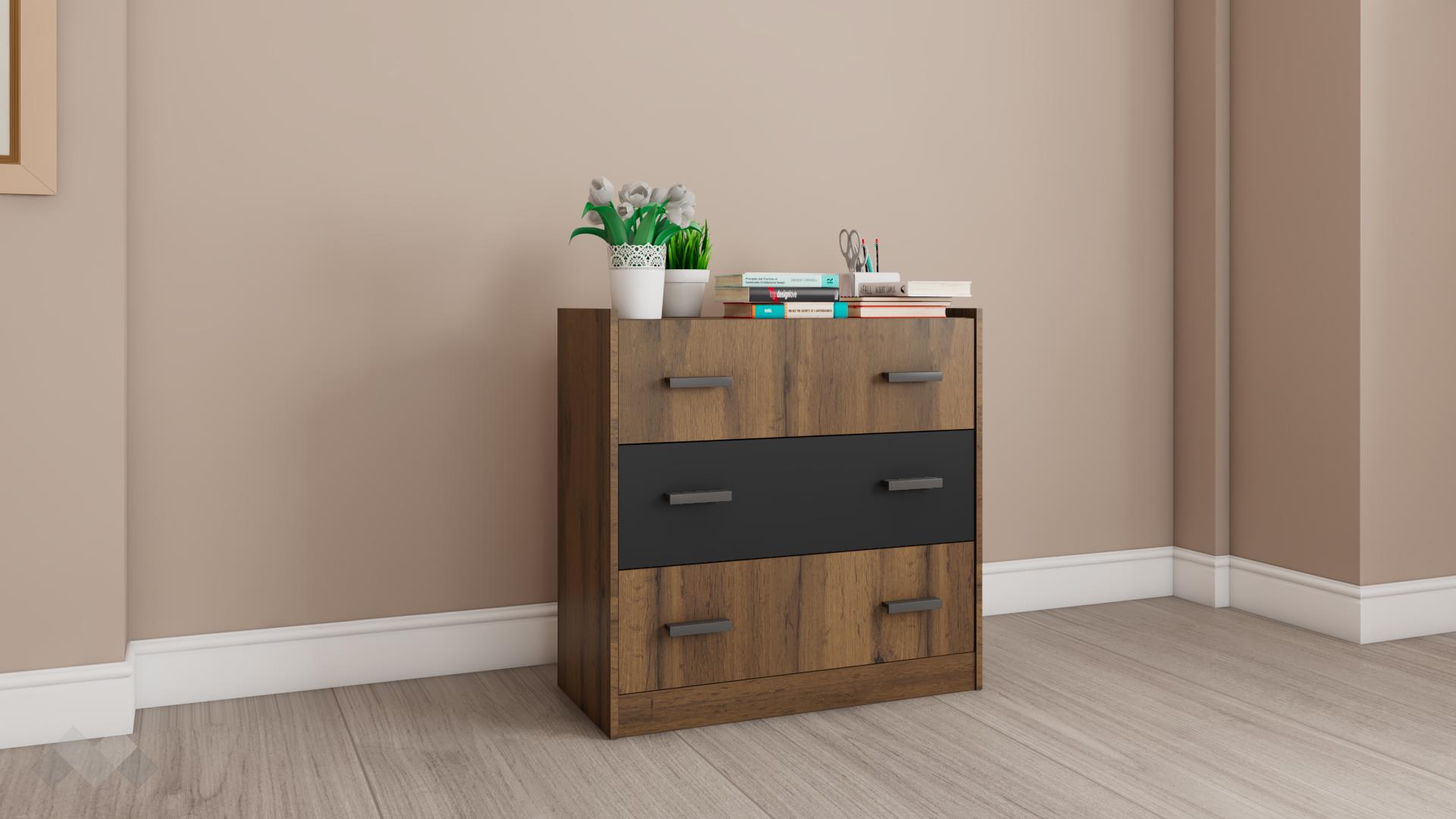⭐ Предимства: ✓ 3 чекмеджета ✓ компактен и практичен ✓ модерен винтидж декор с WNR структура ✓ качествена изработка ✓ 16 мм ПДЧ