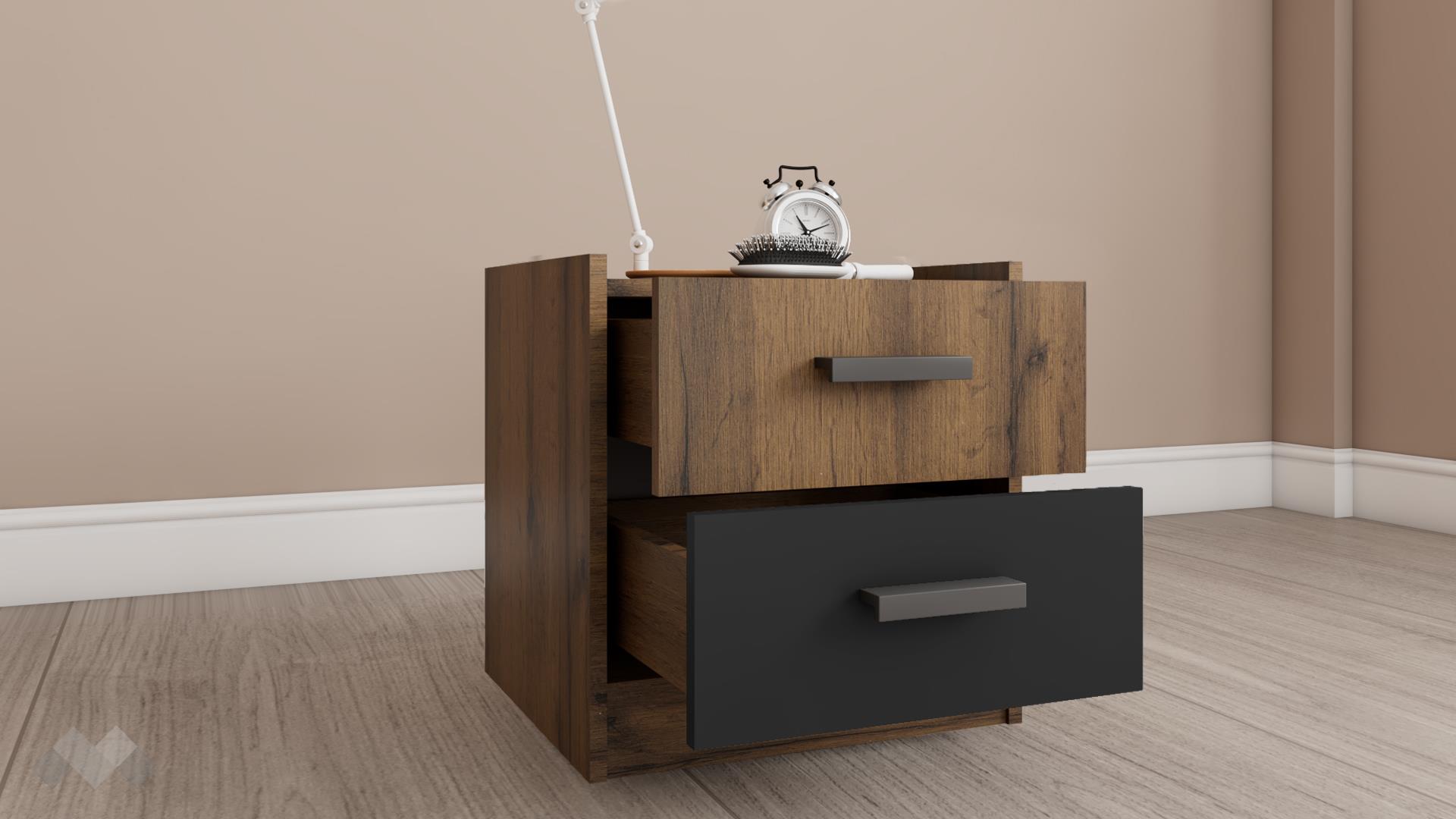 Съчетава се добре, както с цветове в сивата, така и с цветове в кафявата гама. Малък, но практичен, с оптимална височина, пасва буквално на всяко легло. Благодарение на двете чекмеджета, разполагаш с достатъчно място за организация на всякакви вещи и дреболии. Плотът е разположен по-ниско, за да можеш да използваш и него като рафт.
