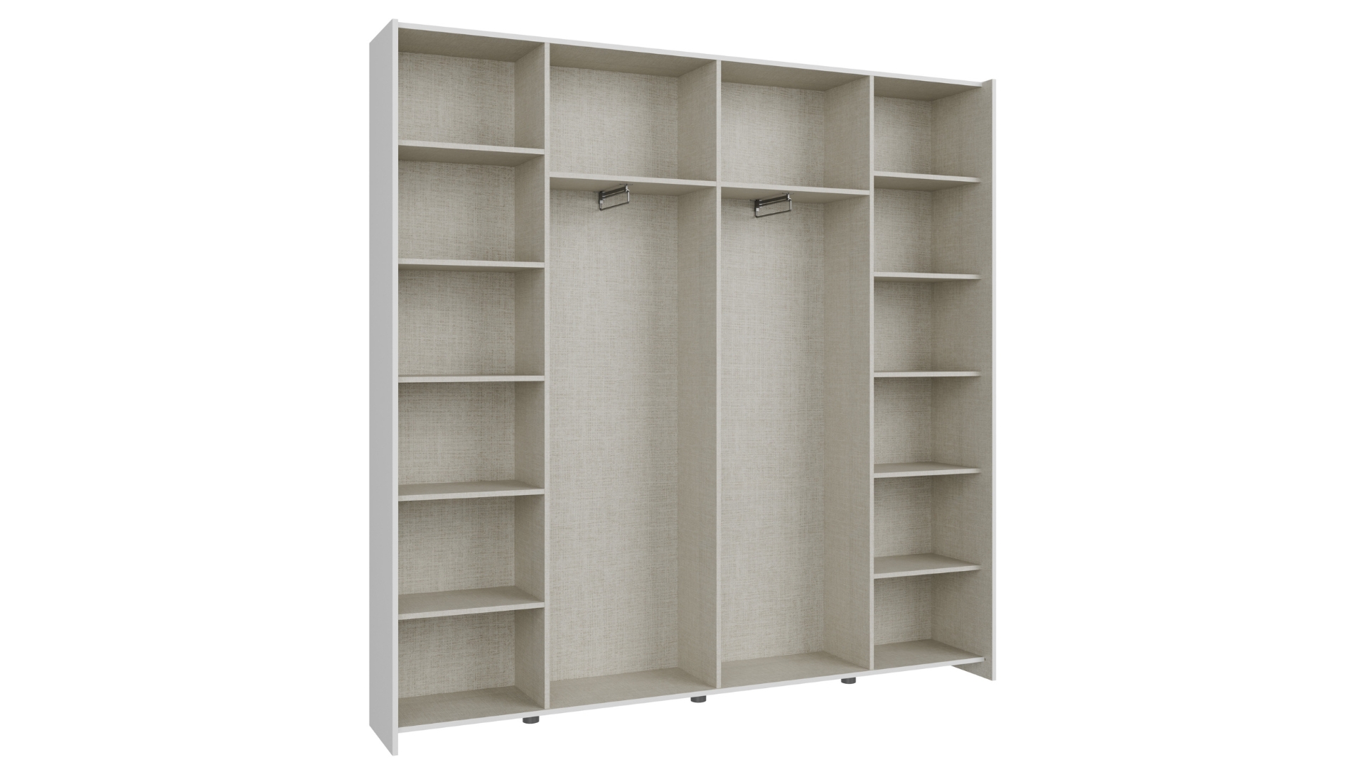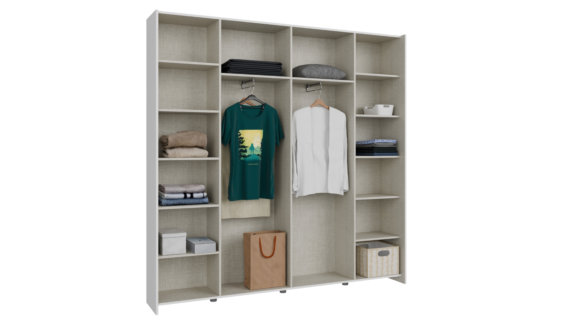 Този гардероб впечатлява със своето оптимално разпределение на вътрешното пространство. Разполага с цели 12 рафта, които осигуряват изобилие от място за подреждане на сгънати дрехи, спално бельо, кутии и други вещи. В допълнение, гардеробът включва два изтеглящи се лоста за закачалки, идеални за съхранение на по-дълги дрехи като рокли, палта или костюми, предпазвайки ги от намачкване.