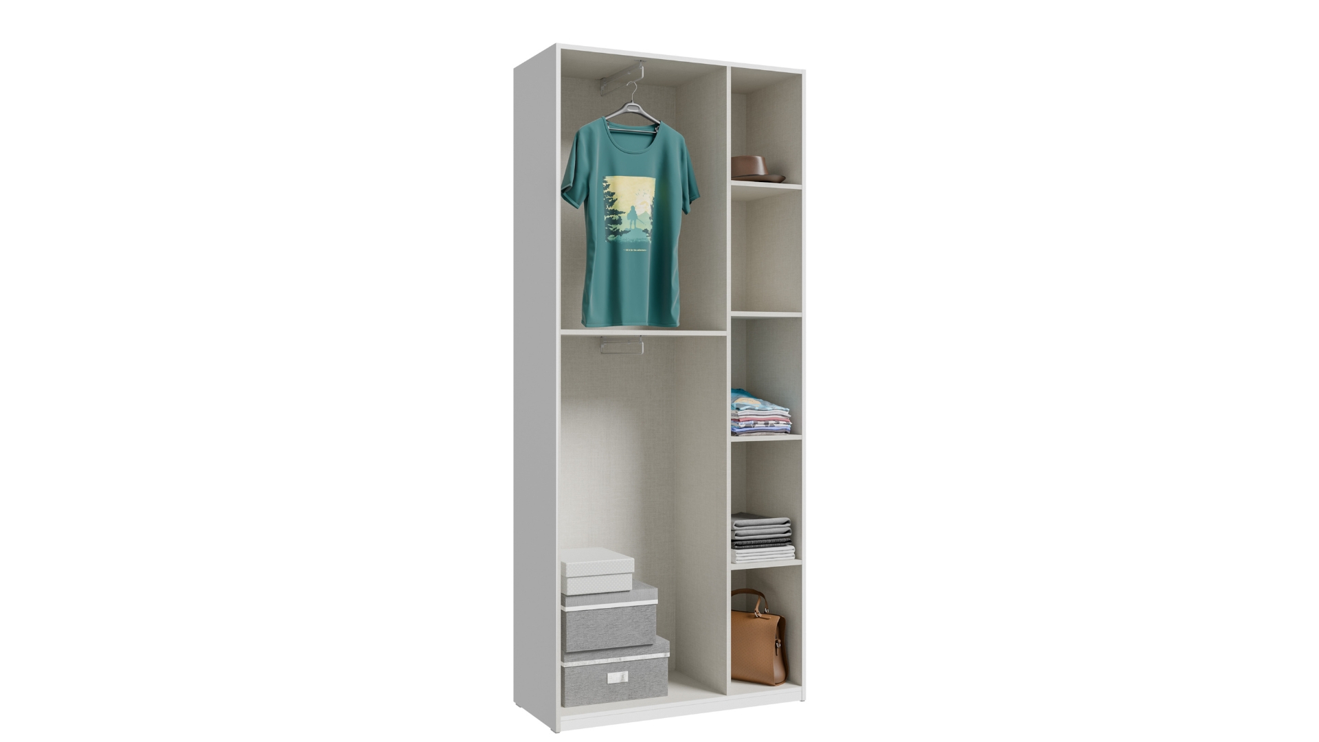 Този гардероб впечатлява със своето оптимално разпределение на вътрешното пространство. Разполага с общо 5 рафта, които осигуряват достатъчно място за подреждане на сгънати дрехи, спално бельо, кутии и други вещи. В допълнение, гардеробът включва два изтеглящи се лоста за закачалки, идеални за съхранение на по-дълги дрехи като рокли, палта или костюми, предпазвайки ги от намачкване.