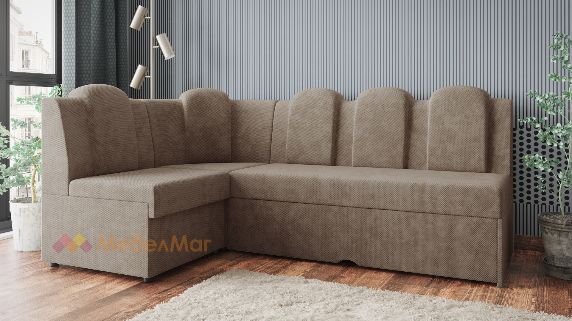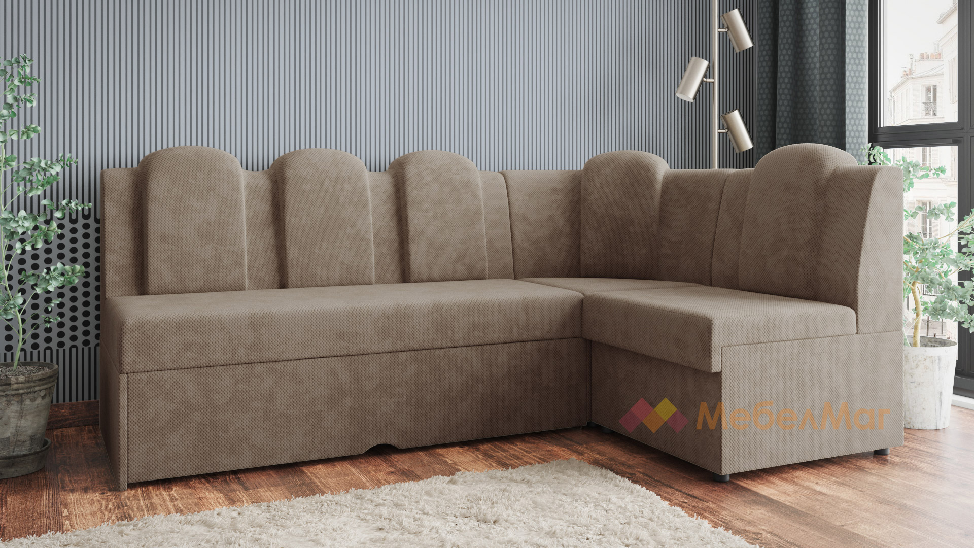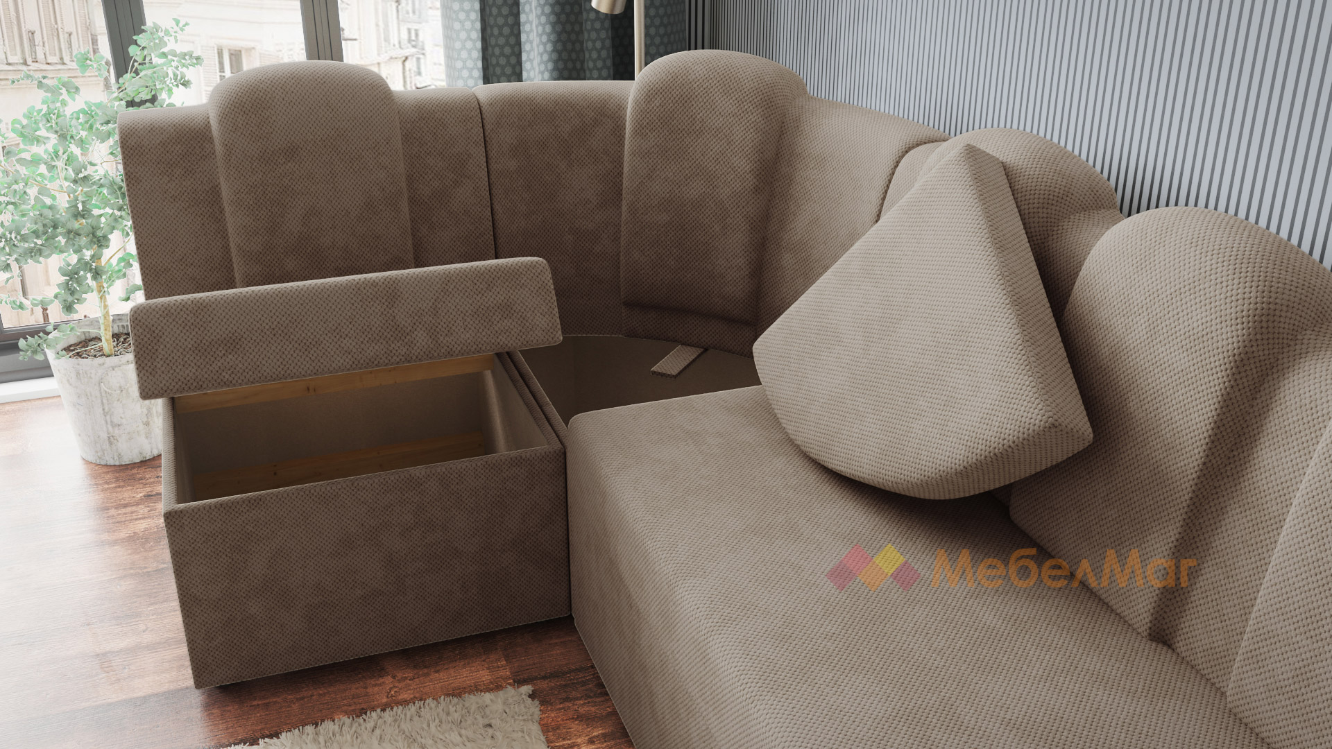 Височината на ъгъла и твърдостта му е съобразена с необходимата височина за седене при хранене. Позицията на гърба е по-изправена, отново съобразена с оптималната поза за хранене. За допълнително удобство поставихме 5 възглавници, вградени в гърба на дивана. Диванът разполага и с две ракли - под лежанката и в ъгловата част.