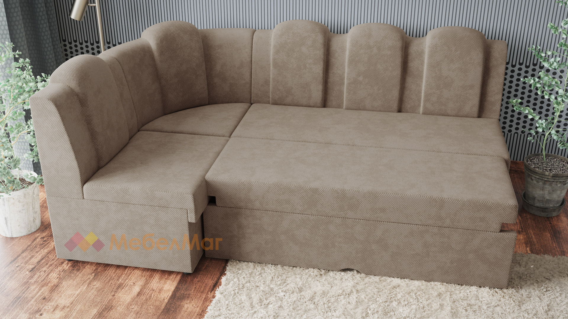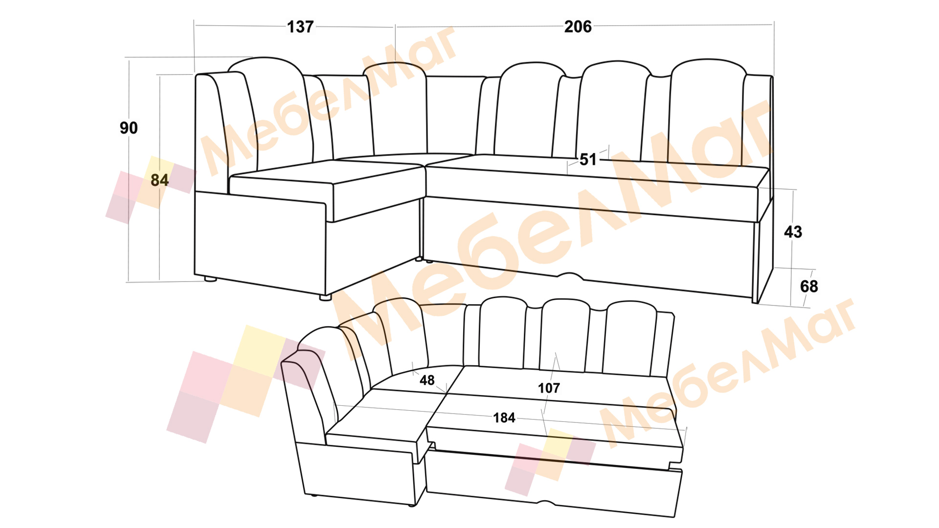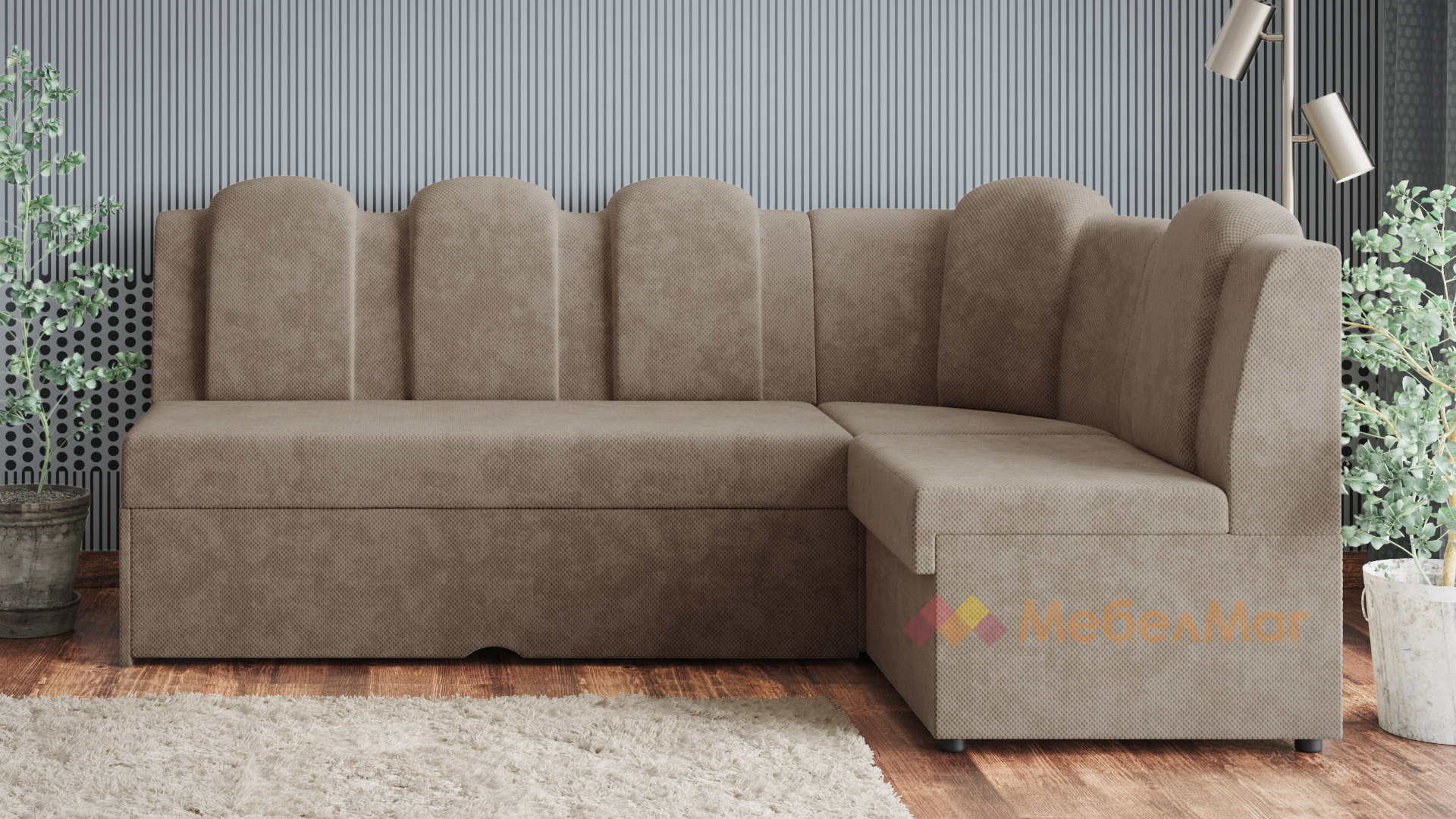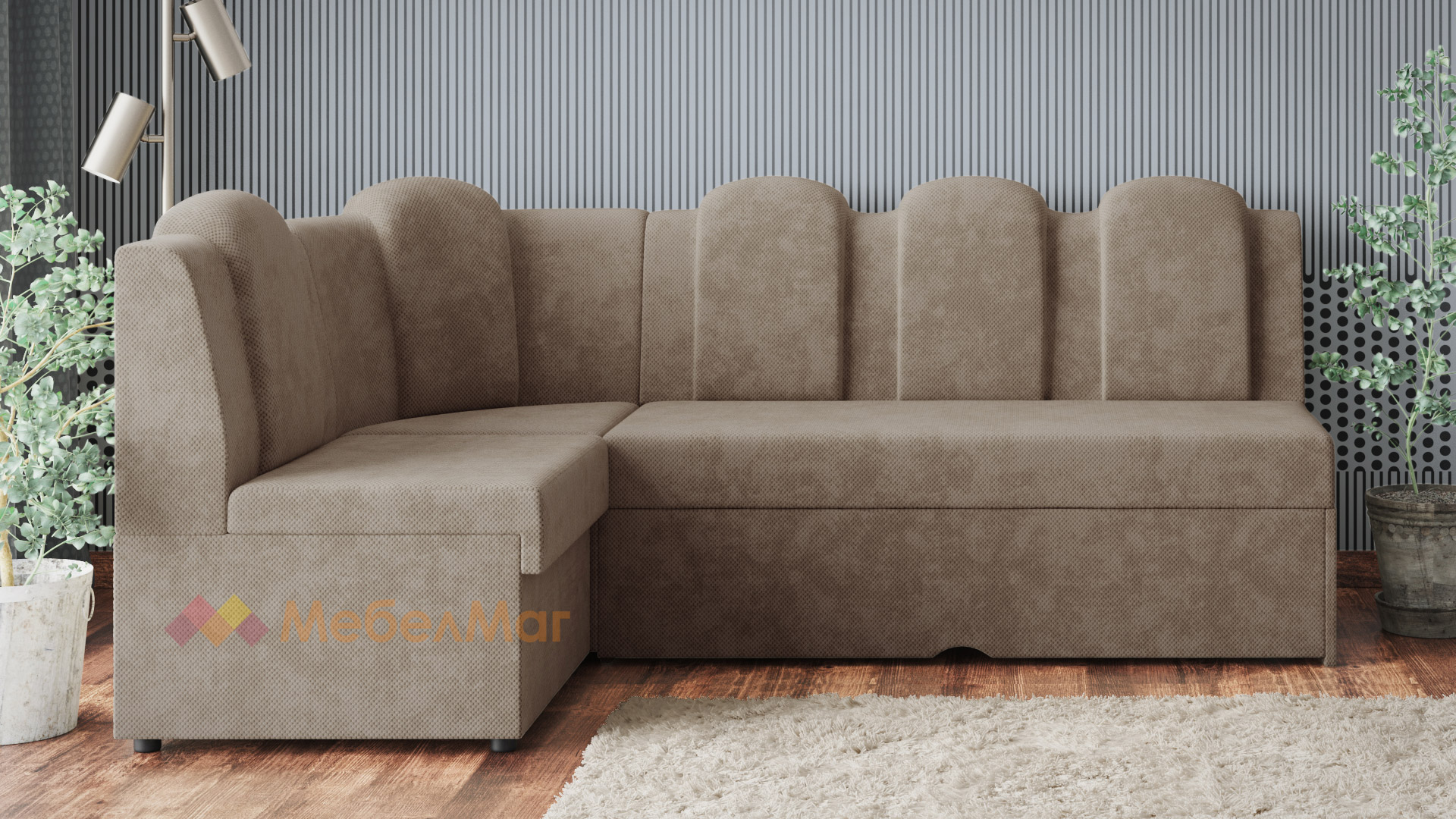 Височината на ъгъла и твърдостта му е съобразена с необходимата височина за седене при хранене. Позицията на гърба е по-изправена, отново съобразена с оптималната поза за хранене. За допълнително удобство поставихме 5 възглавници, вградени в гърба на дивана. Диванът разполага и с две ракли - под лежанката и в ъгловата част.