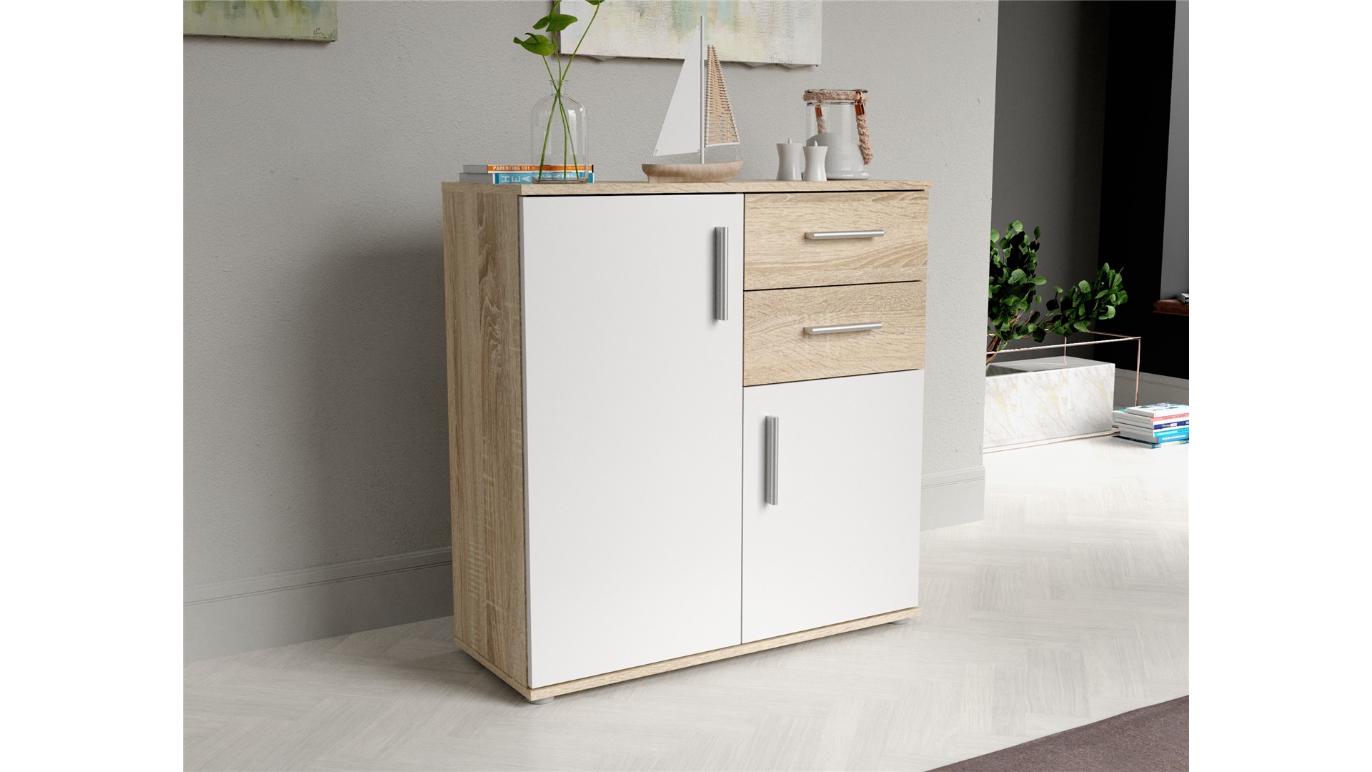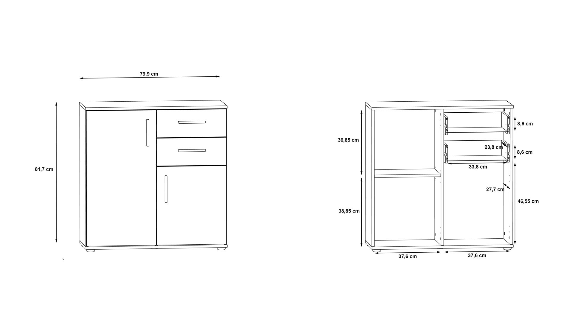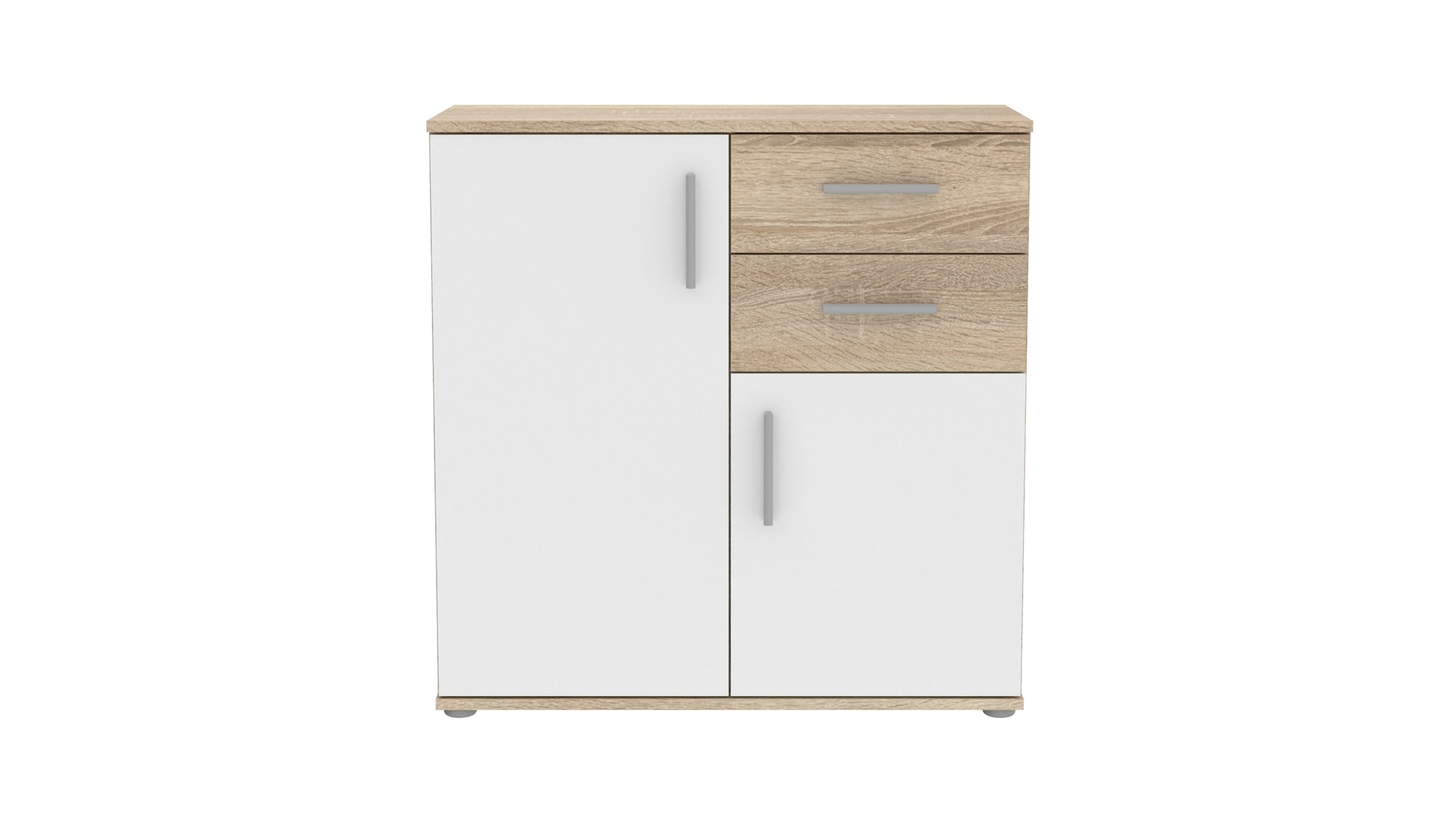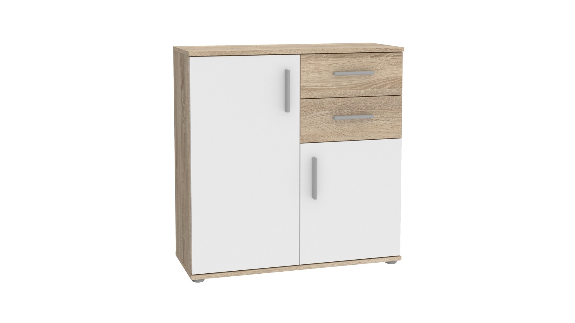 На твое разположение са две просторни чекмеджета със сачмени водачи, които осигуряват плавно и безшумно отваряне и затваряне. Освен това са изключително издръжливи във времето, така че можеш да разчиташ на тяхната надеждност в дългосрочнен план. Има и два затворени шкафа, единият от които е разделен с рафт. В тях можеш да организираш сгънати дрехи, бельо, малки електроуреди, аксесоари или други необходими за теб вещи. Горният плот е идеален за подреждане на декорации, книги или козметика, които да ти бъдат винаги под ръка. Скринът е универсален и ще намери приложение във всяка стая. Можеш да го поставиш в спалнята, дневната или коридора – моделът ще оправдае очакванията ти и ще ти служи дълго.